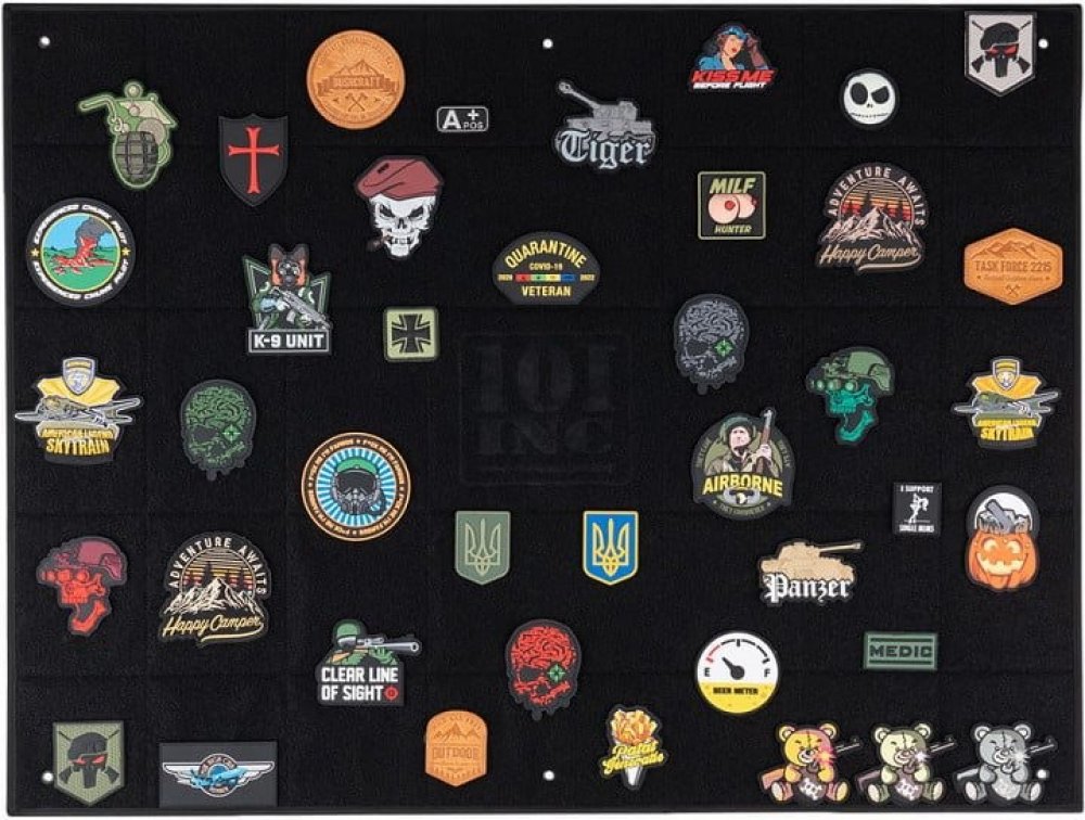 Velký skládací pořadač určený pro organizaci a vystavení nášivek na suchý zip.
