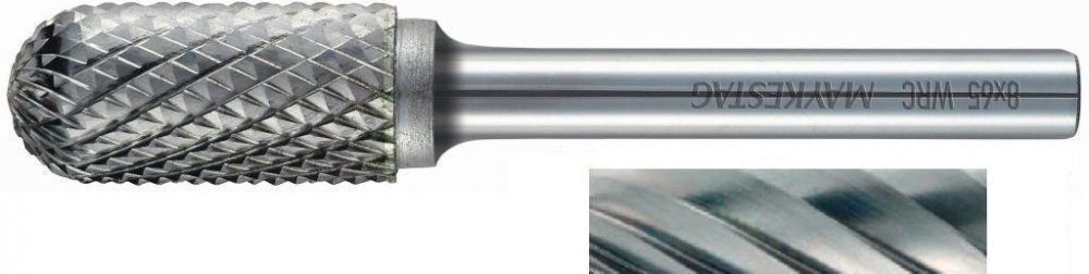 Karbidová soudkově kulatá technická fréza typu WRC s řezným profilem dle DIN C, 6 mm válcovou stopkou, průměrem pracovní části 16 mm, délkou pracovní části 25 mm a celkovou délkou 70 mm.