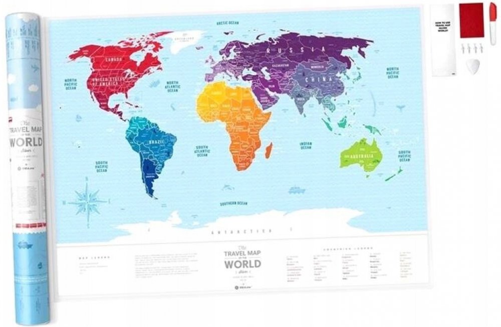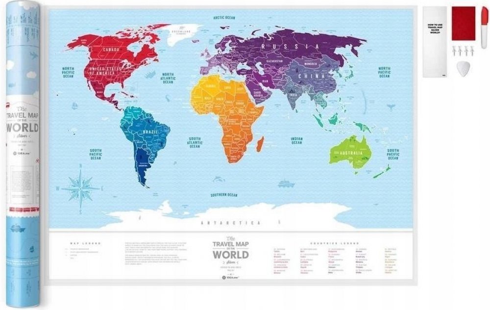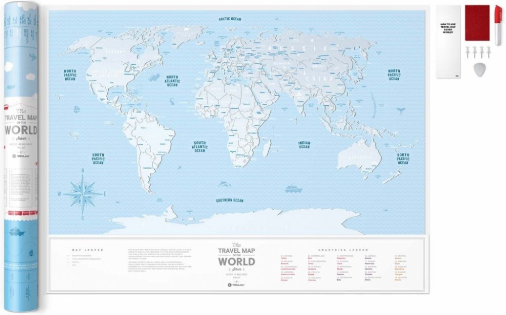 Travel Map (TM) Silver World je minimalistická a stylová mapa světa pokrytá stříbrnou stírací vrstvou. Můžete snadno objevit místa na světě, která jste již navštívili, a vytvořit tak velkolepý záznam historie svých cest. Stačí použít přiloženou kostku a odstranit stříbrnou vrstvu. Navíc můžete speciálním červeným perem kreslit plány svých dalších cest a na mapě označit další místa, která chcete navštívit. Všechny zápisky lze snadno odstranit hadříkem, který je součástí nádobí. Travel Map(TM) Silver World je zaměřena na lidi s opravdovým smyslem pro vkus a styl. Hodí se do moderních i klasických interiérů. Mapa je vyrobena z plastu odolného proti přetržení o rozměrech 250 g/m2 a o rozměrech 60 x 80 cm. Skvělý nápad na originální a krásný dárek pro každou příležitost. Balení obsahuje: Cestovní mapu (TM) Silver World Designová tuba na ukládání Škrabací kostka Červený fix na kreslení po mapě 4 připínáčky Přívěsek na zavazadlo Hadřík na čištění mapy Návod