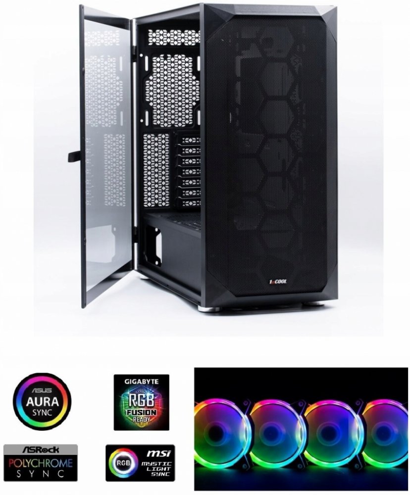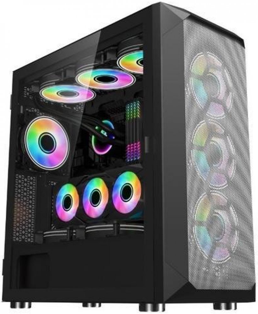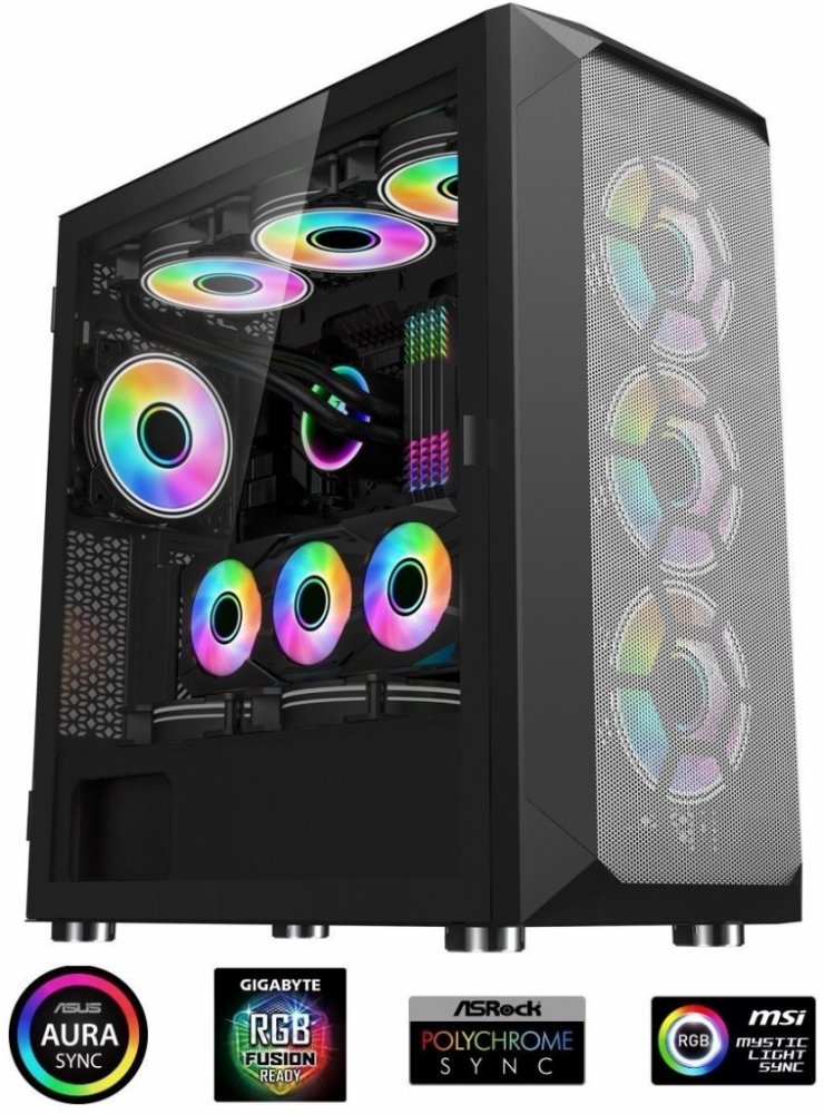 Súčasťou výbavy je SET ventilátorov s adresovateľnými RGB LED diódami - skladá sa zo 4 ventilátorov 120mm RAINBOW ARGB s možnosťou prepojenia s Vašou základnou doskou pomocou 3pin aRGB konektora + nano/reset radič (riadenie LED osvetlenia pomocou ľubuovoťného tlačidla napr. reset)