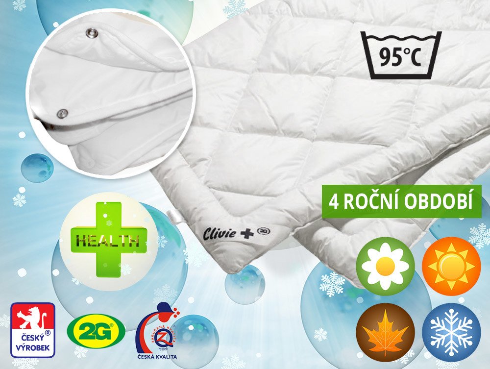 Spínací deka pro volbu výhřevnosti v závislosti na ročním období. Vysoce kvalitní vyvařovací program české výroby. Řada výrobků Clivie+ 95°C je vyvinuta pro všechny, kteří mají zvýšené nároky na hygienu lůžka. Potahová látka je vyrobena ze směsi bavlny a polyesteru, náplní je kvalitní duté polyesterové vlákno. Přikrývku je možné vyprat až na 95°C, proto je oblíbenou variantou pro alergiky, senior...