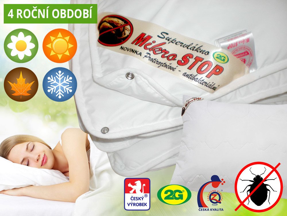 Polštář a spínací dvojitá deka pro volbu výhřevnosti. Sada na jednu postel. Protiroztočový program české výroby. Nadýchané lůžkoviny Mikrostop s elegantním prošitím můžete používat po celý rok. Rozměr na výběr ze souprav: