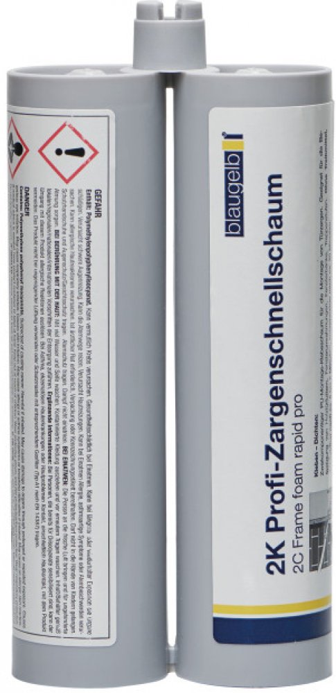 Profesionální rychloupínací pěna blaugelb 2K je dvousložková montážní lepicí PU pěna, která vytvrzuje bez hnacího plynu. Díky spojení obou složek ve statické míchací trubici probíhá vytvrzování velmi rychle. Během doby vytvrzování (pouze přibližně 20 minut) je nutné použití rozpěr do zárubně.
