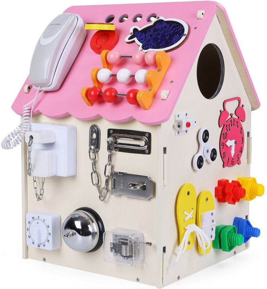 Od zvonku až k telefonu! Tento domeček přináší spoustu zábavy, díky které bude moci Vaše dítě rozvíjet svou zručnost, zvídavost a zejména jemnou motoriku. Zámky, pásky a tkaničky dávají dítěti možnost procvičovat různé vázaní, spojování, otáčení či otevírání a připravit se tak zábavným způsobem na každodenní úkony. Mimo aktivit zapojující smyslové dovednosti deska disponuje i edukativními prvky ja...
