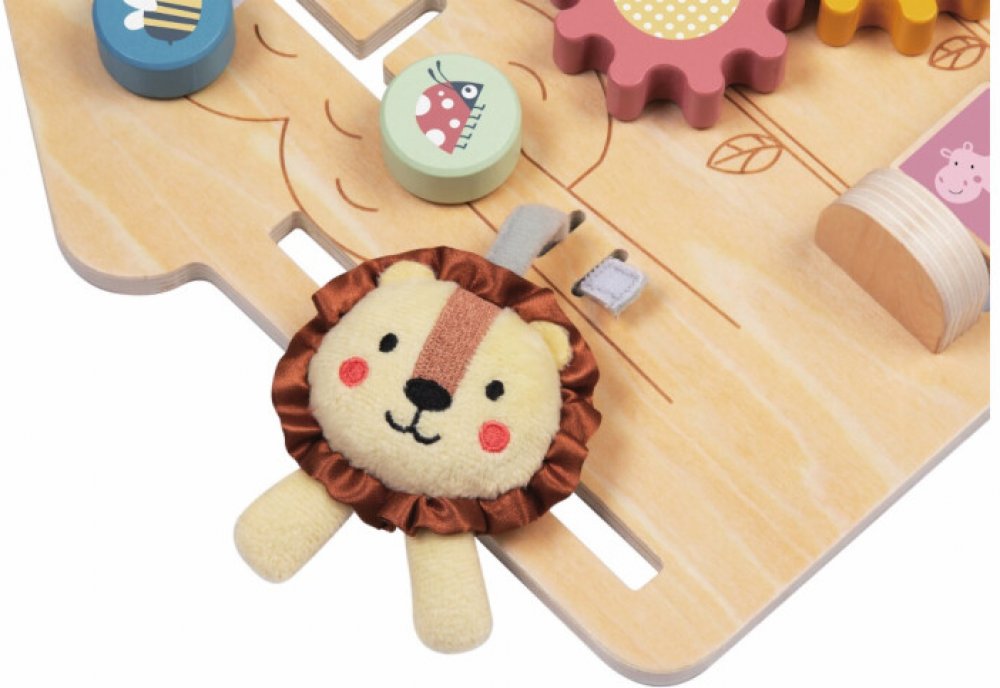 Tato hrací deska ve tvaru domečku s motivem lvíčka přináší spoustu zábavy, díky které bude moci Vaše dítě rozvíjet zručnost, zvídavost a jemnou motoriku. Různé aktivity jako je korálkový labyrint, ozubená kolečka, otáčecí a posuvné destičky s obrázky zvířátek a další dávají dítěti možnost procvičovat otáčení, otevírání či zavírání a připravit se tak na úkony každodenního života. Jemné barvy, rozto...