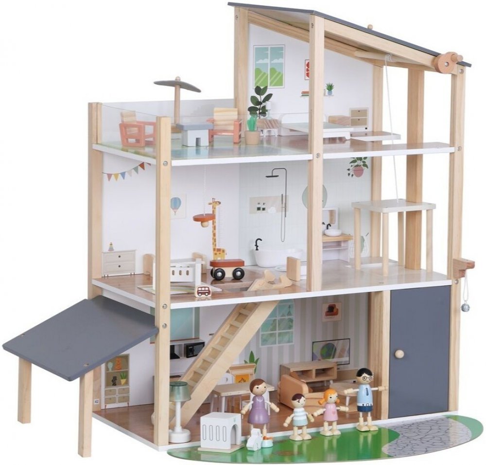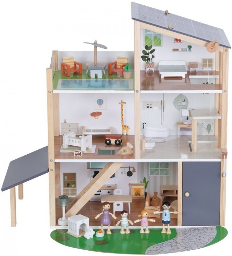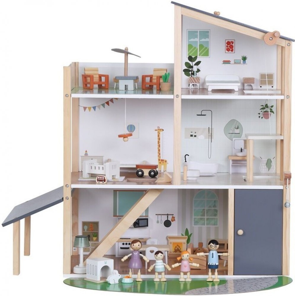 Vítejte v domečku, kde se bydlí jedna radost! Prostorný dřevěný domek je plně vybavený nábytkem i doplňky. Najdete v něm prostornou kuchyni propojenou s útulným obývacím pokojem, stylovou koupelnu s vanou, dětský pokojíček, ložnici i luxusní střešní terasu pro chvíle pohody. A aby toho nebylo málo, nechybí ani výtah. Zatočte kličkou a vyvezte rodinku až do druhého patra. Součástí sady je roztomilý domácí mazlíček králíček s vlastním domečkem a čtyřčlenná rodina připravená zabydlet se a začít psát svůj příběh. Děti si při hře rozvíjejí fantazii, sociální dovednosti i smysl pro detail. A hlavně se výborně baví! Hravý design, jemné barvy spolu s kvalitním provedením dělají z této hračky krásný doplněk každého pokojíčku nebo herny. Domeček je dodáván v rozloženém stavu a vyžaduje montáž. Návod k sestavení je součástí balení.