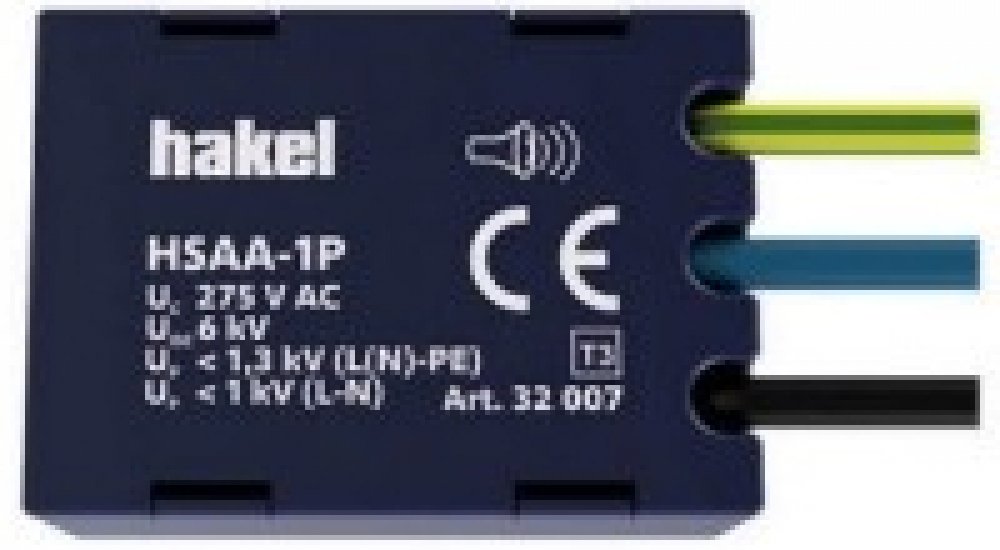 Svodiče přepětí typu T3 určené pro montáž do instalačních a podlahových krabic a lištových rozvodů. Doplňková ochrana zásuvkových rozvodů, které jsou ošetřeny přepěťovou ochranou s vysokofrekvenčním filtrem (HSAF, HSAF3). Lze použít i k ochraně svítidel LED. Instalují se na rozhraní zón LPZ 2 – LPZ 3, co nejblíže k chráněnému zařízení (max. 5 m). Před HSAA-1P musí být instalován svodič bleskových proudů a přepětí T1 a T2 od společnosti HAKEL. Instaluje se dle norem: ČSN EN 62305 ed. 2, ČSN 33 2000-5-53 ed. 3, ČSN CLC/TS 61643-12.