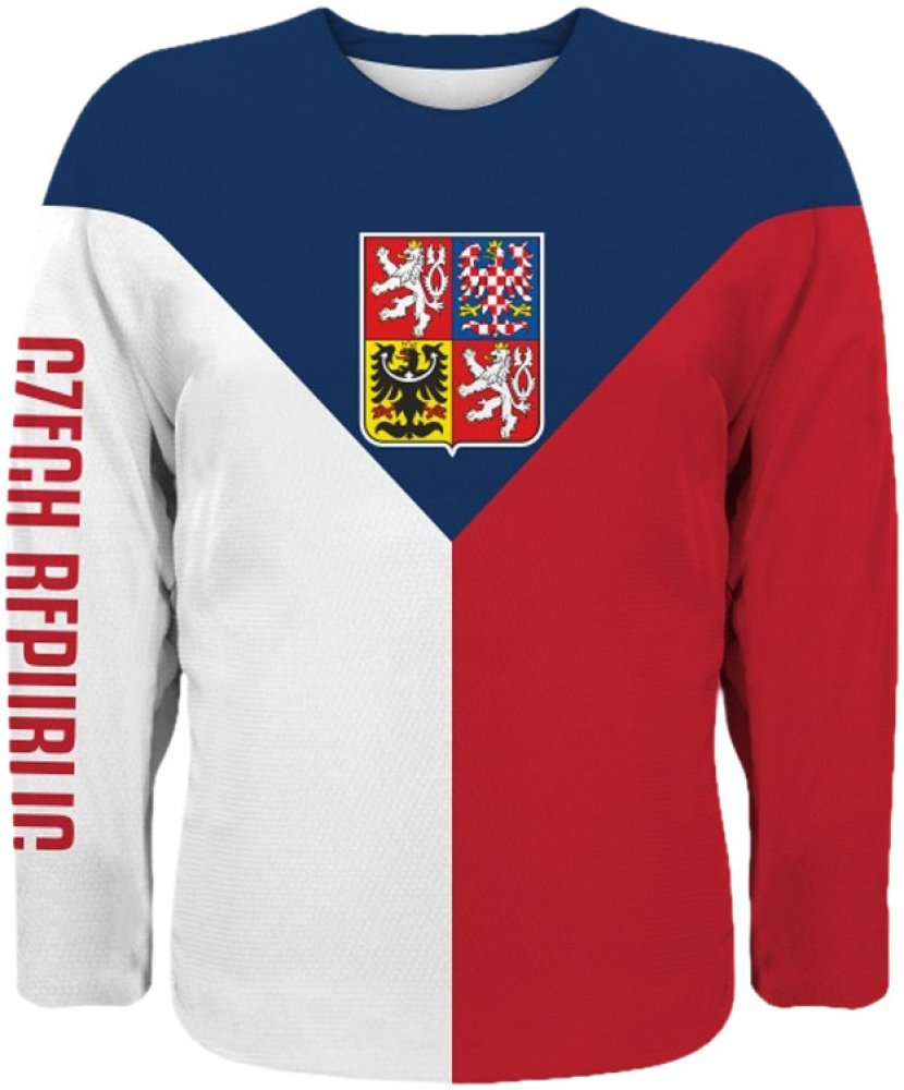 Stylový hokejový fan dres CZECH REPUBLIC v provedení barev české vlajky, vyroben sublimačním tiskem.
