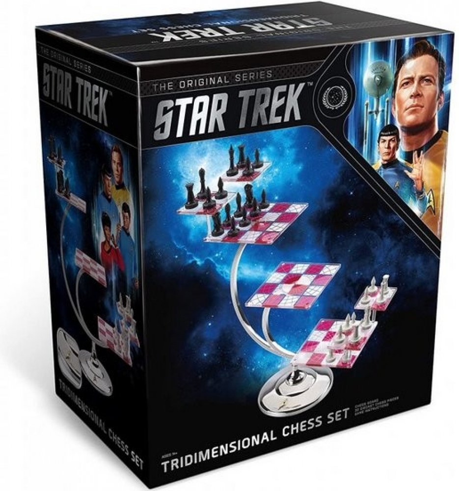 Třídimenzionální šachy ze Star Treku, které znáte ze seriálu Teorie velkého třesku. Šachová deska se skládá ze 3 hlavních desek a 4 menších odnímatelných desek. Obsahuje 32 šachových figur. Balení obsahuje pravidla hry. Materiál: akrylové desky na zinkové základně. Oficiálně licencováno.