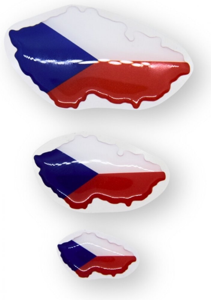 3D samolepka vlajky ČR ve tvaru republiky s povrchovým zalitím glazurou, vytvářející trojrozměrný efekt, zvýrazňující jas barev a poskytující ochranu proti mechanickému poškození.