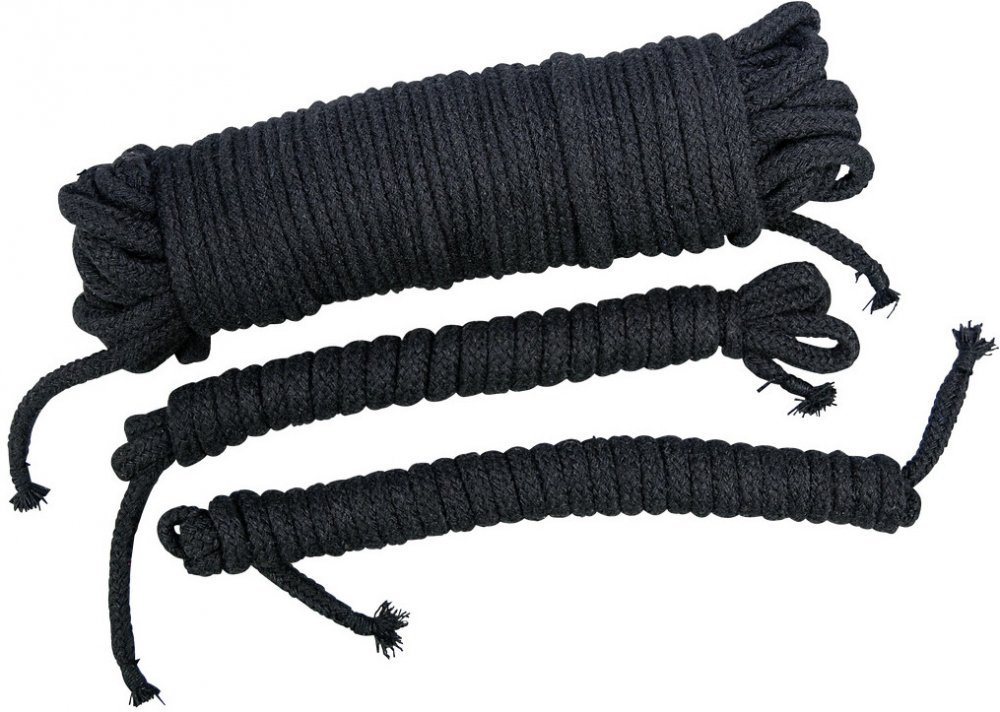 Soubor 3 bavlněných lan určených pro bondage. Lana v délce 1x20m, 2x3m, černé barvy, materiál 100% bavlna. Vhodný doplněk vašich sexuálních hrátek a širokých erotických představ.