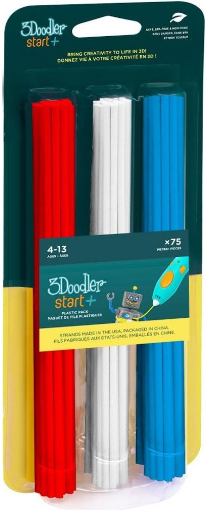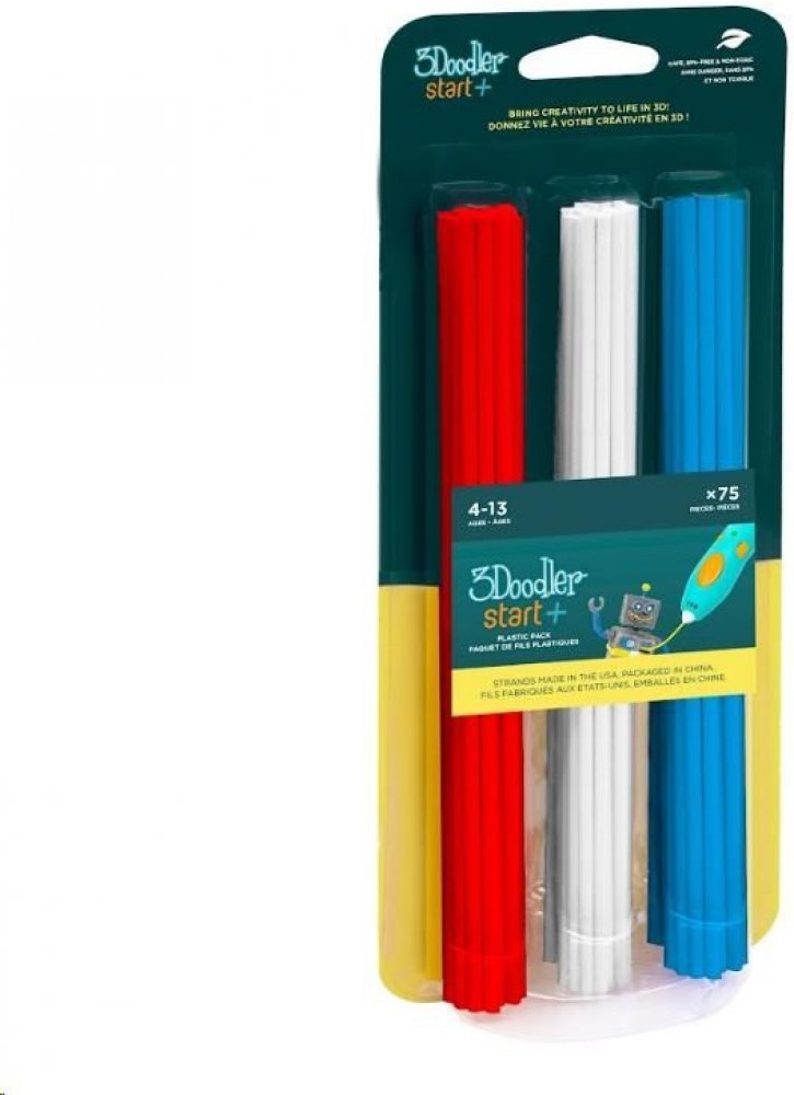 Filamenty 3Doodler Start+ o průměru 2,5 mm jsou bezpečné a biologicky odbouratelné náplně do fixů 3Doodler Start+ a Start . Sada obsahuje 75 náplní ve třech barvách: červené, bílé a modré . Skvělá volba pro kreativní hraní pro děti, která poskytuje hodiny nápadité zábavy.