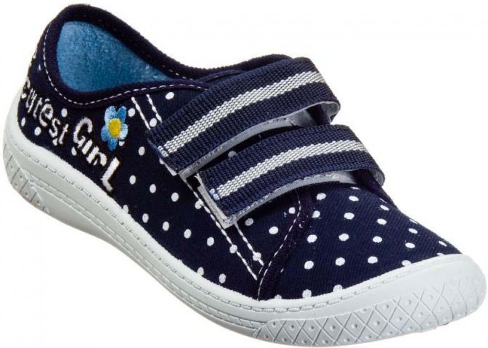 Plátěné, tmavě modré, dívčí tenisky do interiéru mají plátěný vzdušný svršek, lehkou, pružnou podešev, zpevněnou patu i dostatečně širokou špičku pro volný pohyb prstů nohou. Jsou vhodné pro užší a střední šířku nožičky.