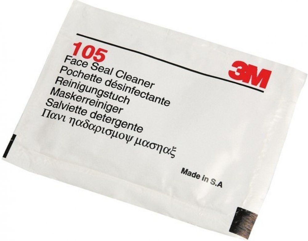 3M™ Čistič na obličejová těsnění 105 se dodává ve formě jednotlivě balených zvlhčených ubrousků a je určen k čištění obličejové části bez jejího poškození.
