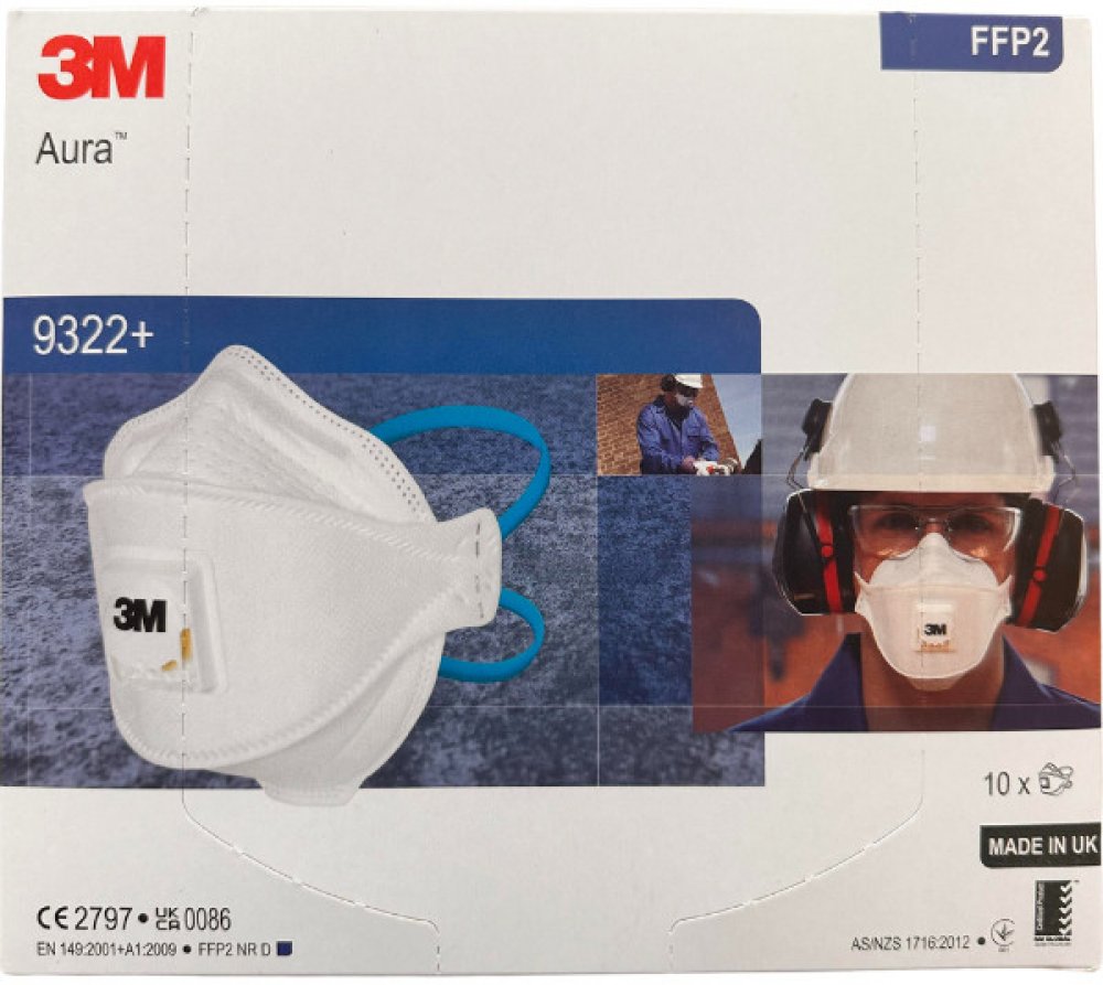 3M™ 9322+ Aura™ Filtrační polomaska proti pevným částicím poskytuje ochranu dýchání FFP2 s designem ke složení na plocho, 3panelovým designem, nízkým dýchacím odporem a reliéfním, tvarovaným horním panelem, který pomáhá snižovat zamlžování brýlí. Je vybavena inovativním podbradním úchytem ke snadnému nastavování a barevně kódovanou náhlavní páskou pro rychlou a snadnou identifikaci. Ventilek 3M™ Cool Flow™ může pomoci snížit hromadění tepla.