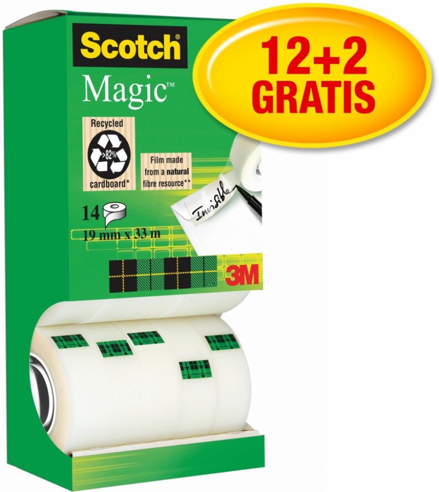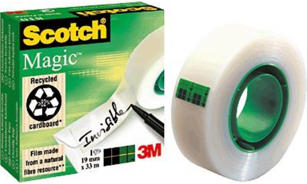 Scotch Magic pásky jsou včetně jádra vyrobeny z přírodního materiálu celulózy, což je obnovitelný recyklovaný přírodní zdroj. Kartónový obal je vyroben z 82% z recyklovaného materiálu. Výrobek šetrný k přírodě. 19mmx33m