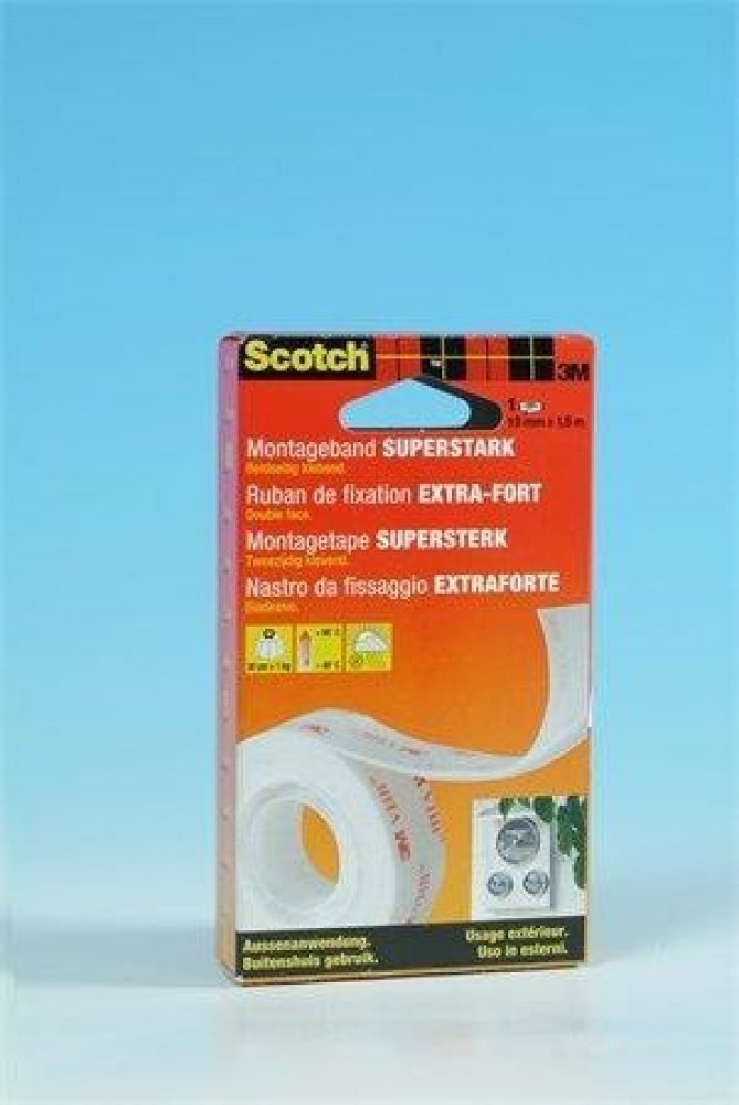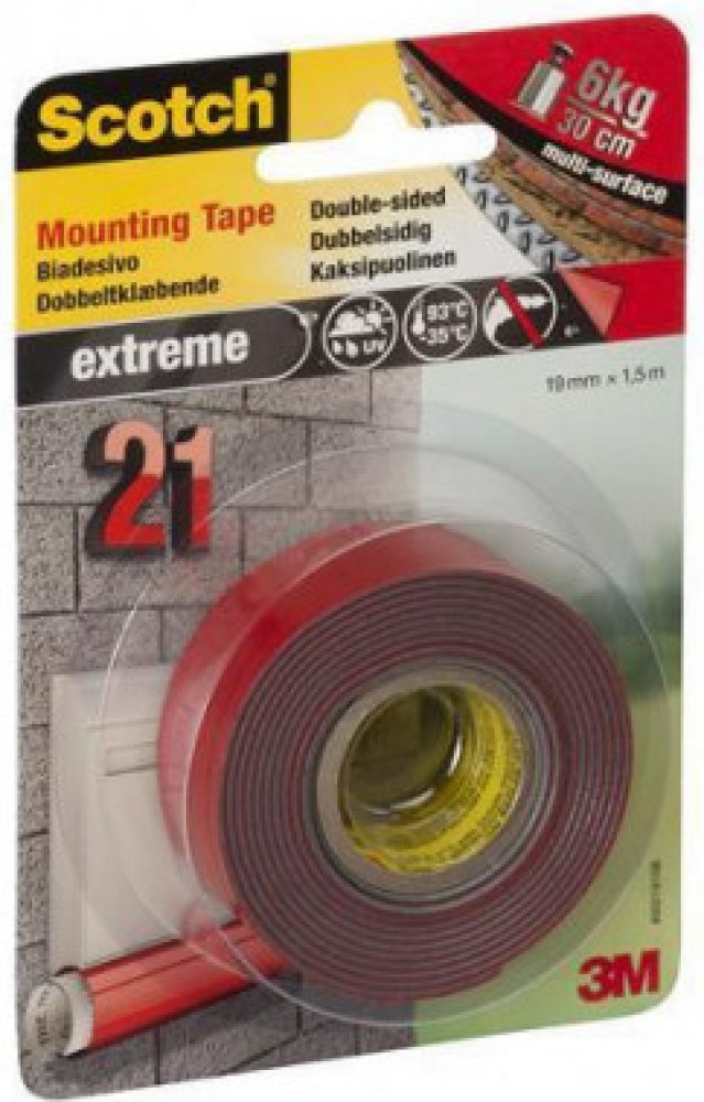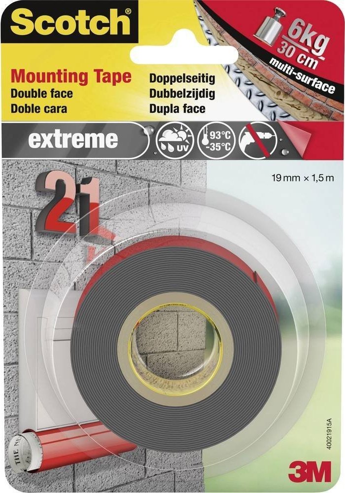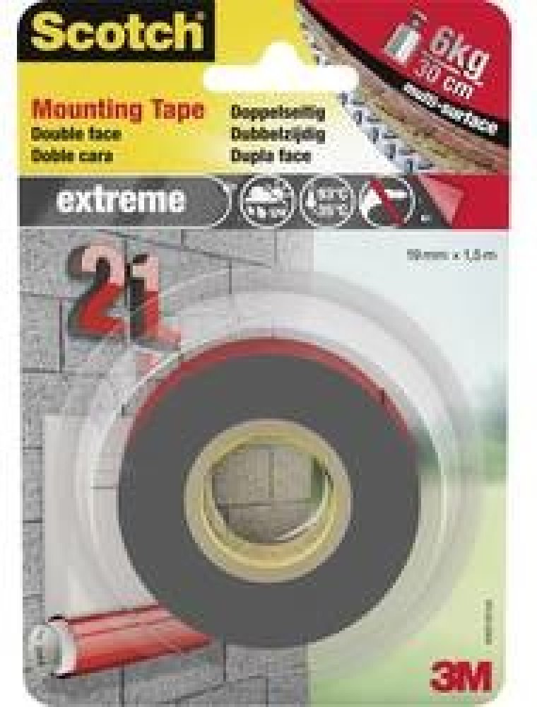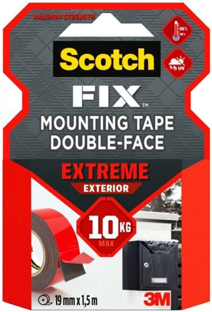 Venkovní montážní páska Scotch-Fix Extreme s nejnovější technologií od 3M. Tato vysoce kvalitní přizpůsobivá permanentní páska udrží až 10 kg a je určena pro venkovní použití a extrémní podmínky. Je ideální pro malované sádrokartonové desky, lakované/hladké dřevo, kov, akryl, hladký kámen a lakovaný beton.