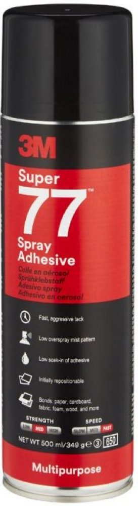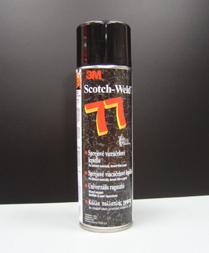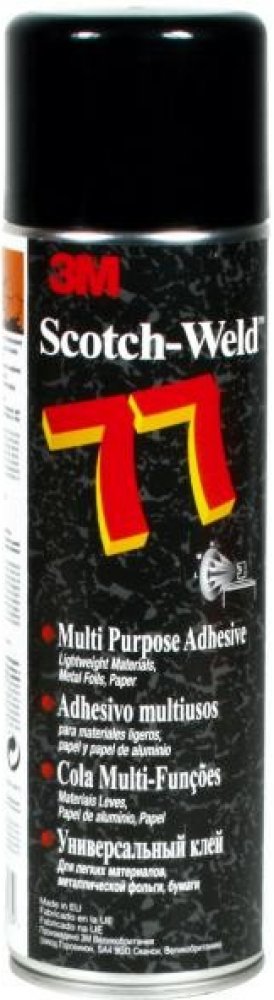 Víceúčelové sprejové lepidlo 3M Scotch-Weld 77 má rychlou počáteční lepivosti při aplikaci na jeden povrch. Při aplikaci na oba povrchy má dlouhou otevřenou dobu. Obzvláště vhodné pro lepení polystyrenových pěn. U porézních substrátů se nanáší na oba lepené povrchy, u hladkých materiálů na jeden z povrchů.