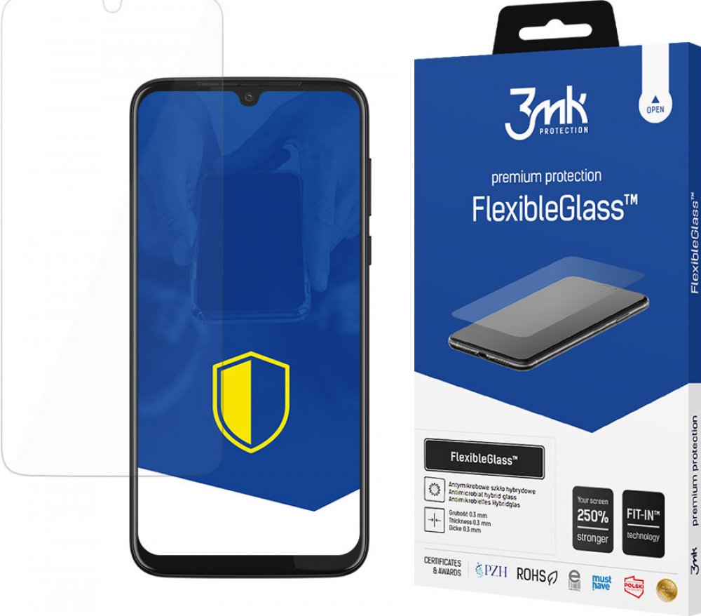 Hybridní sklo 3mk FlexibleGlass pro Motorola Moto G8 Plus s tloušťkou pouhých 0,3mm představuje vysokou odolnost a perfektní ochranu pro vaše mobilní zařízení, kombinuje nejlepší vlastnosti fólie a skla. Tato skla pokytují neviditelnou ochrannou vrstvu na displeji přístroje, s tvrdostí na úrovni 7H zajistí nepoškrábání displeje a poskytne mu zvýšenou životnost až o 250%. Tvrzená skla FlexibleGlass jsou velmi pružná, lze je ohýbat. Vysoký dojem pocitu autentického dotyku skutečného displeje je docilen 100% přesností a citlivostí, které je docíleno přesnou laserovou technologií výroby a flexibilními vlastnostmi materiálů. Bezproblémová aplikace bez bublinek díky nelepivé látce Inviscid-Sil™ a samolepícím štítkům Fit-In™, které pomáhají přesně umístit FlexibleGlass na displej. Produkt vyhovuje směrnici RoHS. Certifikát RoHS potvrzuje výrobu skla v souladu s normami ochrany životního prostředí. To znamená, že produkt neobsahuje ani neobsahuje stopy nebezpečných látek, jako jsou: olovo (Pb), rtuť (Hg), kadmium...