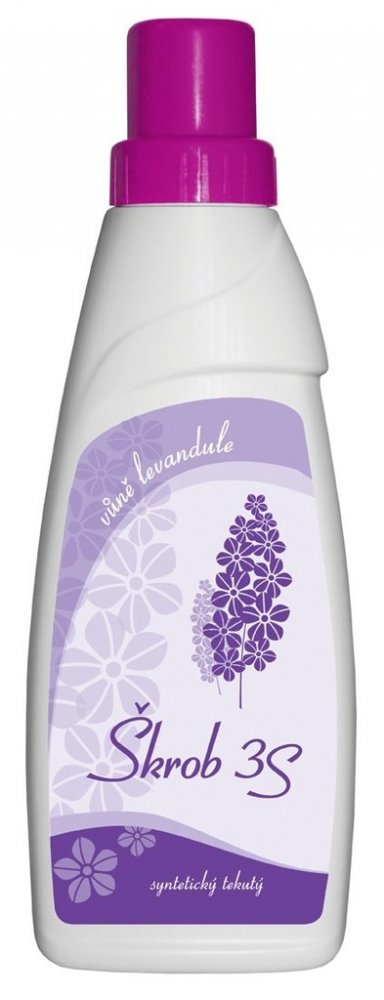 Syntetický tekutý škrob 3S Levandule. Tekutý prostředek pro škrobení prádla a záclon. Obsahuje optický zjasňovač, který dodává textilu a zejména záclonám vysokou bělost.