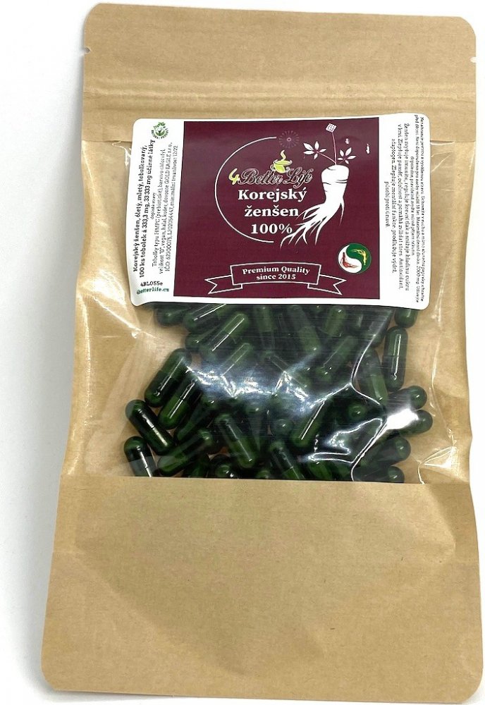 100 HPMC (přírodní látka, prebiotikum, vegan, barveno chlorofylem) tobolek, baleno v potravinovém uzavíratelném sáčku, každá tobolka obsahuje 333,3 mg mletého korejského ženšene, 6ti letého, velmi kvalitního. Vegetariánské HP...