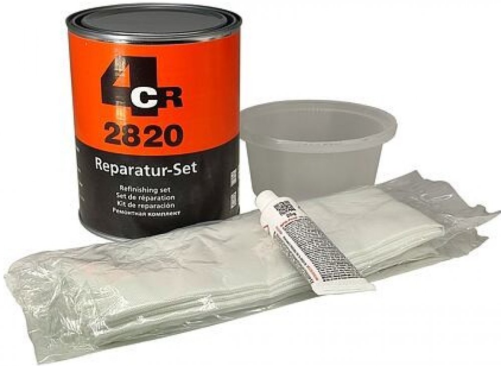 Laminovací opravářská sada s PE pryskyřicí, 1kg Velká laminovací souprava 2820 od značky 4CR obsahuje 1000 gramů polyesterové laminovací pryskyřice , skelnou tkaninu a benzoyl-peroxidové tužidlo . S touto kompletní laminovací sadou bez problémů opravíte větší díry či otvory na plechových a plastových dílech karosérie. Univerzálnost PE pryskyřice 4CR 2820 spočívá v tom, že má výbornou přilnavost jak na železo, tak i na skelný laminát (GFK). Je tedy vhodná i jako spojovací hmota obou materiálů . Pokud potřebujete například rozšířit blatník, či upevnit nástavbové díly, je pro vás tato laminovací sada super volbou. Laminovací soupravy 2820 od značky 4CR dodáváme v menším 250g a větším 1000g balení.