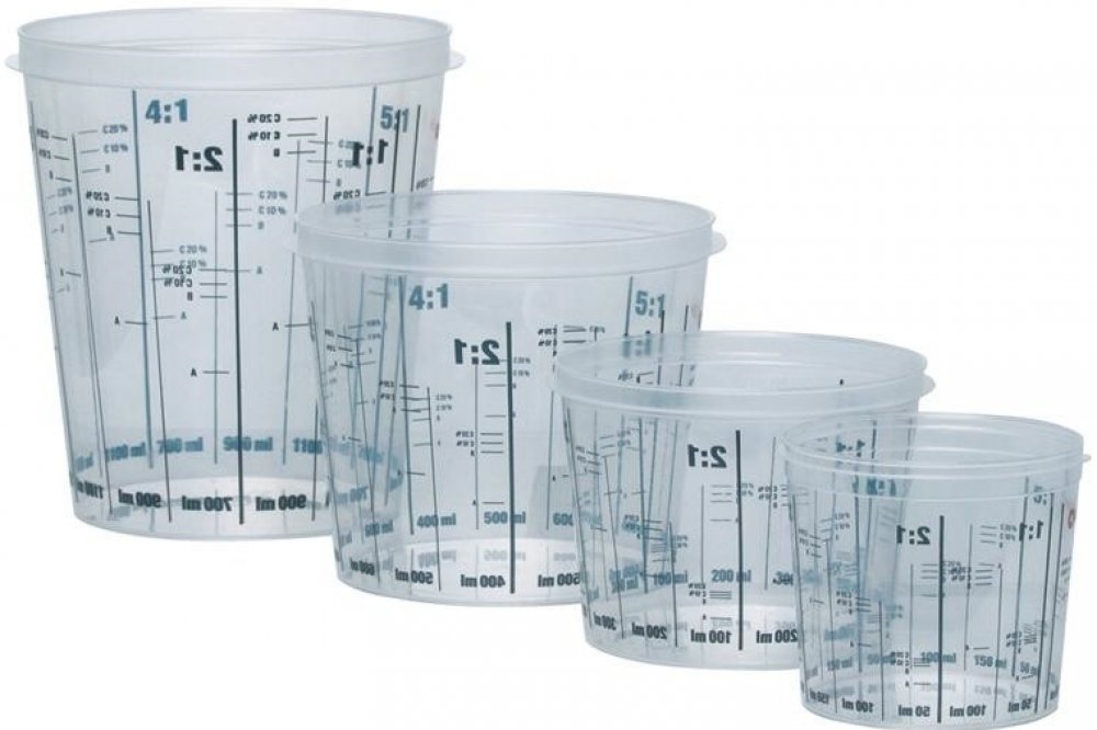 Plastové pohárky různých objemů pro použití na barvy laky. Na boku jsou vytištěny různé mísící poměry. Víčko není součástí balení a ceny.