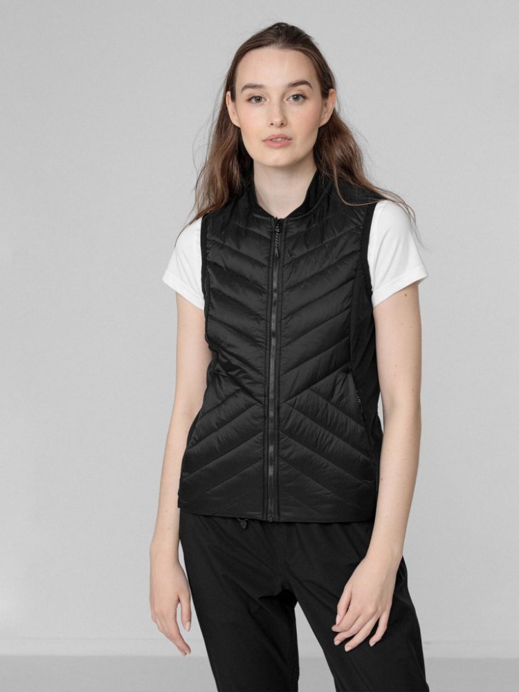 Dámská vesta značky 4F. Vesta do hor je extrémně lehká, ale přesto poskytuje dostatečný tepelný komfort. Dá se jednoduše sbalit do své vnitřní kapsy a snadno přenést. Výplň vesty pro turistiku tvoří ultra tenká vlákna PrimaLoft. Tato výplň šetří životní prostředí, neboť se při její výrobě v 60% používá recyklovaný polyester. Trekkingová vesta dámská má hydrofobní úpravu, která chrání materiál před vlhkostí. Turistická vesta nemá kapuci. Elegantně-sportovní vzhled je dodáván elastický baseballový límec. Po bocích značkové vesty naleznete dvě praktické kapsy na zip. Hlavní zip YKK je podšit ochrannou větruvzdornou légou. Černá vesta pro dámy je vyrobena z odolného materiálu rip-stop. Sportovní vesta je ideální jako samostatná vrchní vrstva, nebo ji můžete využít jako dodatečnou zateplovací vrstvu pod větruodolnou bundu s membránou. Detaily produktu: turistická vesta extra lehká sbalitelná do vnitřní kapsy odolný materiál rip-stop bez kapuce elastický baseballový límec ekologická výplň Primaloft hydrofobní úprava dvě boční kapsy na zip hlavní zip YKK podšitý ochrannou légou proti větru ideální jako samostatná vrchní vrstva nebo dodatečná zateplovací vrstva pod větruodolnou bundu s membránou