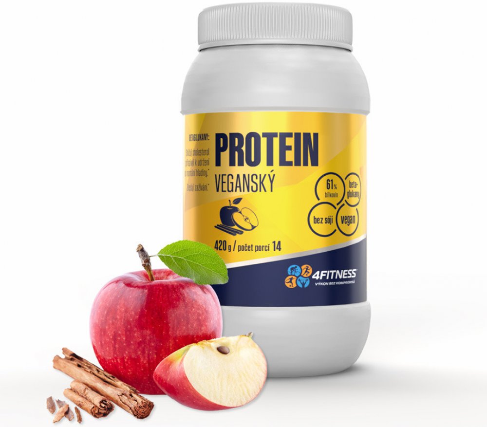 Veganský protein od 4FITNESS je ideální volbou pro všechny, kteří hledají kvalitní zdroj bílkovin bez živočišných složek. Tento produkt kombinuje výhody rostlinných proteinů s vyváženým obsahem vlákniny, vitamínů a minerálů, čímž poskytuje kompletní podporu zdravému životnímu stylu. Poctivé složení - síla rostlinné výživy: Rostlinné proteiny (70 %): hrachový protein a protein z hnědé naklíčené rýže Beta-glukany: Podporují normální hladinu cholesterolu a zažívání* Chia semínka (mletá) a psyllium: Bohatý zdroj vlákniny Přírodní chuť jablka a skořice: Pro autentický chuťový zážitek *Bylo prokázáno, že ovesný beta-glukan snižuje hladinu cholesterolu v krvi. Vysoká hladina cholesterolu představuje rizikový faktor pro vznik koronárního srdečního onemocnění. Příznivého účinku je dosaženo na základě denního příjmu 3 g beta-glukanu. Vláknina ze zrn ovsa přispívá ke zvýšení objemu stolice. Hmotnost výrobku: 420 g Počet porcí: 14 (porce 30 g) Rozpustnost: Výborná, snadno se připravuje Alergeny: lepek. Může obsahovat stopy sóji, mléka, ořechů, vajec, celeru a ryb. Obsah vitamínů a minerálů: např. vitamíny A, D, C, vitamíny skupiny B a minerální látky jako draslík, hořčík, vápník, selen a spoustu dalších. Jak připravit Veganský protein? Odměřte 30 g prášku (cca 2 odměrky) a smíchejte s 250 ml vody nebo oblíbené alternativy mléka. Důkladně protřepejte v šejkru a nechte 3 minuty odstát. Vychutnejte si výživné jídlo kdykoliv během dne! Proč zvolit Veganský protein od 4FITNESS? Vysoký obsah bílkovin (60 %): Podporuje regeneraci, růst svalů a normální stav kostí.* Bez laktózy a sóji: Vhodné pro osoby s intolerancemi. Snížený obsah sacharidů: Skvělá volba pro low carb stravu. Bohatý na vlákninu a vitamíny*: Podpora zdravého zažívání a imunity. Přírodní příchuť: autentická chuť sušeného jablka a skořice. *Bílkoviny přispívají k růstu a udržení svalové hmoty a udržení normálního stavu kostí. Vitamin C přispívá k normální funkci imunitního systému Pro koho je Veganský protein vhodný? Sportovce a aktivní jedince: Podpora regenerace a výkonnosti. Zastánce zdravého životního stylu: Kompletní výživa bez živočišných složek. Osoby s intolerancemi: Bez laktózy, sóji a s nízkým obsahem cukru. Jak dlouho lze užívat Veganský protein? Protein lze užívat dlouhodobě jako bezpečný a efektivní zdroj bílkovin. Díky přemyšlenému složení bez zbytečností je vhodný jako pravidelná součást stravy pro aktivní jedince i ty, kdo chtějí podpořit svůj zdravý životní styl. Pokud plánujete dlouhodobé užívání, doporučujeme konzultaci s odborníkem. Mohu užívat tento Protein v těhotenství? Protein je obecně bezpečný i pro těhotné ženy. Přesto doporučujeme konzultaci s lékařem, který vám pomůže určit optimální dávkování. Produkt je navíc vhodný jako zdroj rostlinných bílkovin pro doplnění jídelníčku během těhotenství. Nežádoucí účinky Proteinového drinku Protein Veganský je většinou dobře snášen. U některých citlivějších jedinců se při nadměrné konzumaci mohou objevit zažívací potíže, jako je nadýmání. Dbejte na dostatečný příjem tekutin. 4FITNESS je výhodný! Veganský protein 4FITNESS je ideální volbou pro každého, kdo hledá vysoce kvalitní rostlinný zdroj bílkovin. Nepromeškejte šanci posílit své tělo a dodat mu porci proteinů! Upozornění: Doplněk stravy. Neslouží jako náhrada pestré stravy. Nepřekračujte doporučené dávkování. Nevhodné pro děti do 3 let. Skladujte mimo dosah dětí, v suchu při teplotě 10–22 °C. Chraňte před přímým slunečním zářením. Výrobce neručí za škody vzniklé nesprávným použitím. Zdroje: Protein quality of pea (Pisum sativum L.) and rice (Oryza sativa L.) proteins in healthy adults. Joy JM, Lowery RP, Wilson JM et al. Plant proteins in relation to human protein and amino acid nutrition. Rutherfurd SM, Fanning AC, Miller BJ, Moughan PJ.