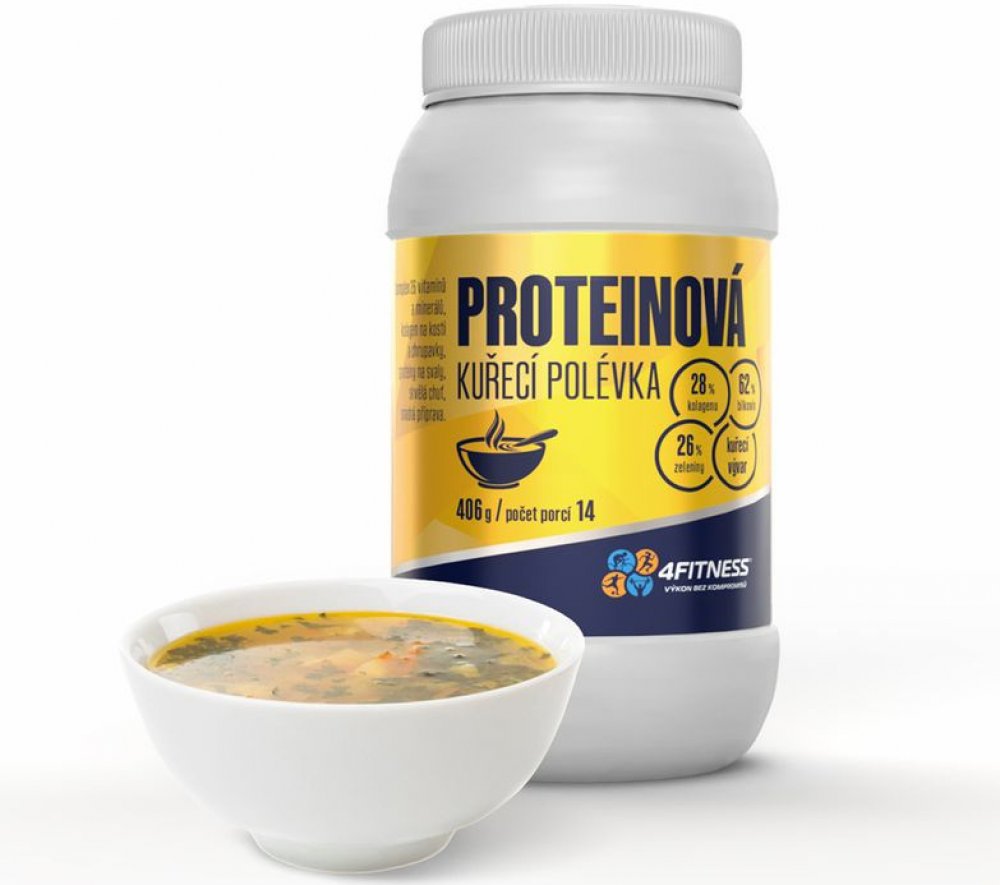 Naše Kuřecí polévka s proteiny je ideálním řešením pro všechny, kdo hledají chutný a výživný zdroj bílkovin. Spojuje sílu hovězího kolagenu a syrovátkového proteinu s bohatou směsí sušené zeleniny a koření, aby poskytla nejen skvělou chuť, ale i podporu pro vaše tělo. Poctivé složení: Hovězí kolagen (28 %): Podporuje zdraví chrupavek a kostí. Syrovátkový protein (19 %): Vysoce kvalitní bílkovina pro svalovou regeneraci*. Sušená zelenina: Bohatý zdroj vitamínů a minerálů (pastinák, cibule, karotka, česnek). Směs koření (5 %): Dodává polévce autentickou chuť. Dehydratovaný kuřecí vývar: Pro bohatou kuřecí chuť. Vitamíny a minerály: Bohatý mix s vitamínem C pro podporu vašeho zdraví*. Hrachová, sójová a rýžová bílkovina: Rostlinné bílkoviny pro komplexní výživu. *Vitamin C přispívá k vlastní tvorbě kolagenu pro normální funkci chrupavek a kostí, bílkoviny přispívají k udržení a růstu svalové hmoty. Hmotnost výrobku: 406 g Počet porcí: 14 (porce 29 g) Rozpustnost: Výborná, snadno se připravuje Alergeny: sója, mléko, vejce. Může obsahovat stopy lepku, ořechů, celeru a ryb. Vitamíny a minerály: Bohatý komplex s vitamíny A, D, C, E, vitamíny B skupiny a spousta minerálů jako hořčík, vápník, zinek, železo a selen... Jak připravit Kuřecí polévku? Odměřte 200 ml horké vody nebo vaší oblíbené alternativy mléka do misky nebo hlubokého talíře. Přidejte 29 g prášku (odpovídá přibližně 2 odměrkám). Krátce promíchejte a ponechte minimálně 3 minuty odstát. Vychutnejte si lahodnou a výživnou polévku kdykoliv během dne! Proč zvolit Proteinovou kuřecí polévku od 4FITNESS? Vysoký obsah bílkovin* (62 %): Podporuje regeneraci svalů a zdraví kloubů. Rychlá a snadná příprava: Ideální pro rušné dny. Snížený obsah sacharidů: Skvělá volba pro low carb stravování. Lahodná chuť: Kombinace kuřecího vývaru, zeleniny a koření. Vitamíny a minerály: nezbytné živiny pro vaše tělo. *Bílkoviny přispívají k růstu a udržení svalové hmoty a udržení normálního stavu kostí. Pro koho je Kuřecí polévka vhodná? Sportovce a aktivní lidi: Podpora sportovního výkonu a regenerace. Příznivce zdravého stravování: Zdroj kvalitních bílkovin. Pro osoby v redukčním stravování: Bohatá na bílkoviny, které zasytí a má snížený obsah sacharidů. Pro ty, kteří nemají čas vařit: Rychlá příprava a nutriční podpora. Jak dlouho lze konzumovat Proteinovou kuřecí polévku? Polévku můžete pravidelně zařazovat do svého jídelníčku jako součást vyvážené stravy. Poskytuje důležité bílkoviny a živiny, které vaše tělo potřebuje. Mohu užívat tuto Kuřecí polévku v těhotenství? Kuřecí proteinová polévka je většinou bezpečná i pro těhotné ženy, přesto se doporučuje poradit se s lékařem před jejím užíváním. Nežádoucí účinky Kuřecí proteinová polévka je většinou snadno stravitelná, ale u citlivých jedinců může při nadměrné konzumaci vést k zažívacím potížím. Doporučuje se dostatečný příjem tekutin. 4FITNESS je výhodný! Za 406 g balení zaplatíte pouhých 637 Kč, což odpovídá 14 porcím. Jedna porce vás vyjde asi na 45,5 Kč! Dostatečné množství pro dva týdny každodenního užívání. Kuřecí polévka proteinová od 4FITNESS je ideální volbou pro každého, kdo hledá vysoce kvalitní zdroj bílkovin a kolagenu. Upozornění: Doplněk stravy. Neslouží jako náhrada pestré stravy. Nepřekračujte doporučené dávkování. Nevhodné pro děti do 3 let. Skladujte mimo dosah dětí, v suchu při teplotě 10–22 °C. Chraňte před přímým slunečním zářením. Výrobce neručí za škody vzniklé nesprávným použitím. Zdroje: Oral collagen hydrolysate in the treatment of osteoarthritis and other joint disorders Clark KL, Sebastianelli W, Flechsenhar KR et al. Role of vitamin C in collagen synthesis and skin aging. Pullar JM, Carr AC, Vissers MCM.