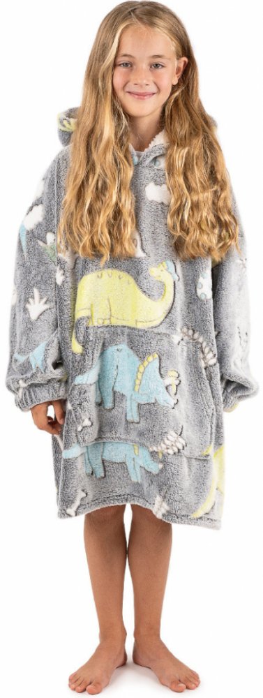 Hurá za zábavou a dobrodružstvím, ale zároveň hezky v teple! Pohodlné a měkoučké pončo s hravým dinosauřím motivem na šedém podkladu jistě potěší každého malého objevitele. Kapuce je z vnitřní strany z měkkého beránkového materiálu, díky kterému bude vaše dítě v pohodlí a teple. Pončo je navíc vyrobeno speciální metodou, při které je do vzoru přidáno fluorescenční vlákno, které po nasvícení svítí. Má všechny potřebné atesty a splňuje všechny požadavky na zdravotní nezávadnost. Stačí ho ponechat přes den na přímém slunečním světle nebo pod vnitřním osvětlením. Pončo se přirozeně „nabije“, aby večer mohlo zářit.Čím bude světlo intenzivnější, tím více a déle bude produkt ve tmě svítit. Doporučujeme nechat na světle „nasvítit“ co nejdéle, minimálně však 10 minut.