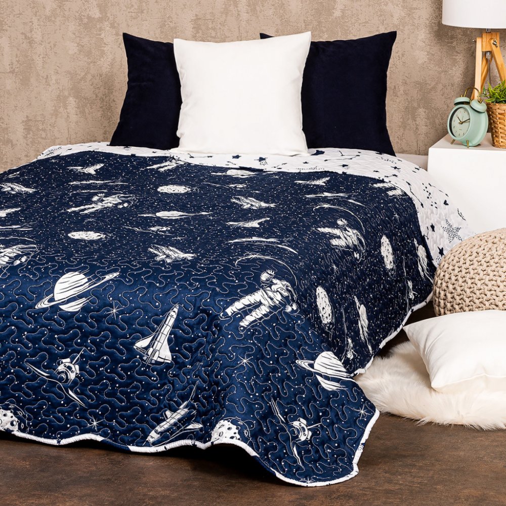 Proměňte svou postel ve stylovou vesmírnou základnu s originálním prošívaným přehozem. Díky oboustrannému provedení získáte vlastně dva přehozy v jednom – z jedné strany tmavě modrý podklad s jednoduchým bílým motivem planet a kosmonautů, druhá strana je bílá se vzorem hvězd a souhvězdí. Decentní motiv působí elegantně, a zároveň dodá hravý tón každému interiéru. Zkrátka skvělý doplněk pro malé i velké kosmonauty.Přehoz na postel však není jen krásný, je také praktický. Ochrání vaše povlečení před vyblednutím i všudypřítomným prachem, a navíc bude vaše postel vždy rychle ustlaná. Vyrobený je z hebkého mikrovlákna a díky jemnosti materiálů vám může pohodlně sloužit i jako deka.Polštářky nejsou součástí balení.