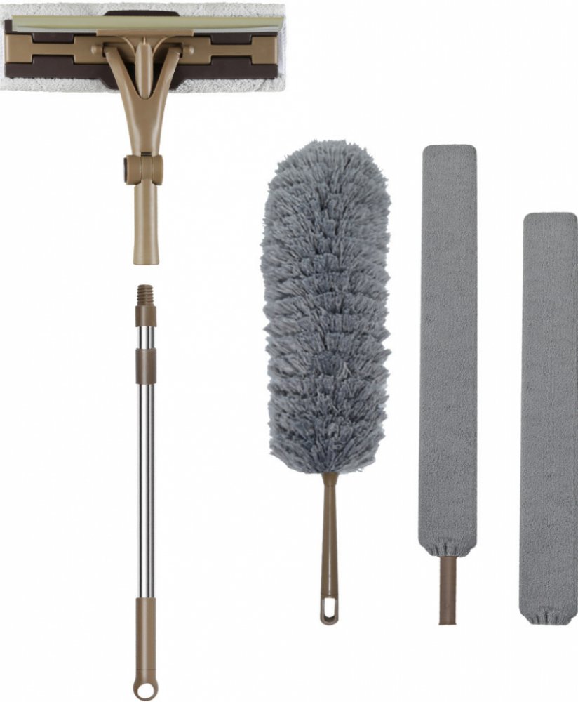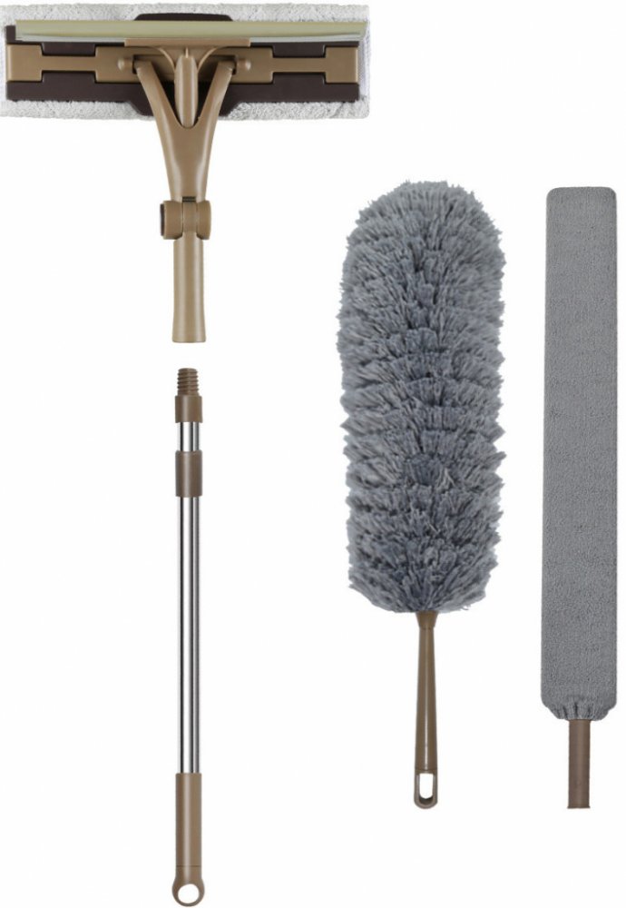 Ušetřete místo s praktickým pomocníkem pro úklid, který zastane nejen stěrku na okna, ale i prachovku. K jedné tyči totiž získáte hned 3 nástavce. Tyč je teleskopická, takže snadno uklidíte i na vysokých skříních a umyjete velká okna bez balancování na židli nebo schůdkách. Každý nástavec lze díky univerzální šroubovací koncovce použít i samostatně bez tyče.Oboustranná stěrka na okna má z jedné strany klasickou stěrku a z druhé houbičku s pratelným návlekem z mikrovlákna, takže hravě zvládne mytí i leštění. Další dva nástavce přidávají do setu 2 druhy prachovek – klasický střapatý oprašovač a dlouhou hladkou prachovku na ohebném základu, díky kterému se s ní dostanete doslova do každého kouta. Návlek hladké prachovky lze použít i za mokra. Je snímatelný a poslouží i samostatně jako klasický hadřík na úklid.Obsah sady:
