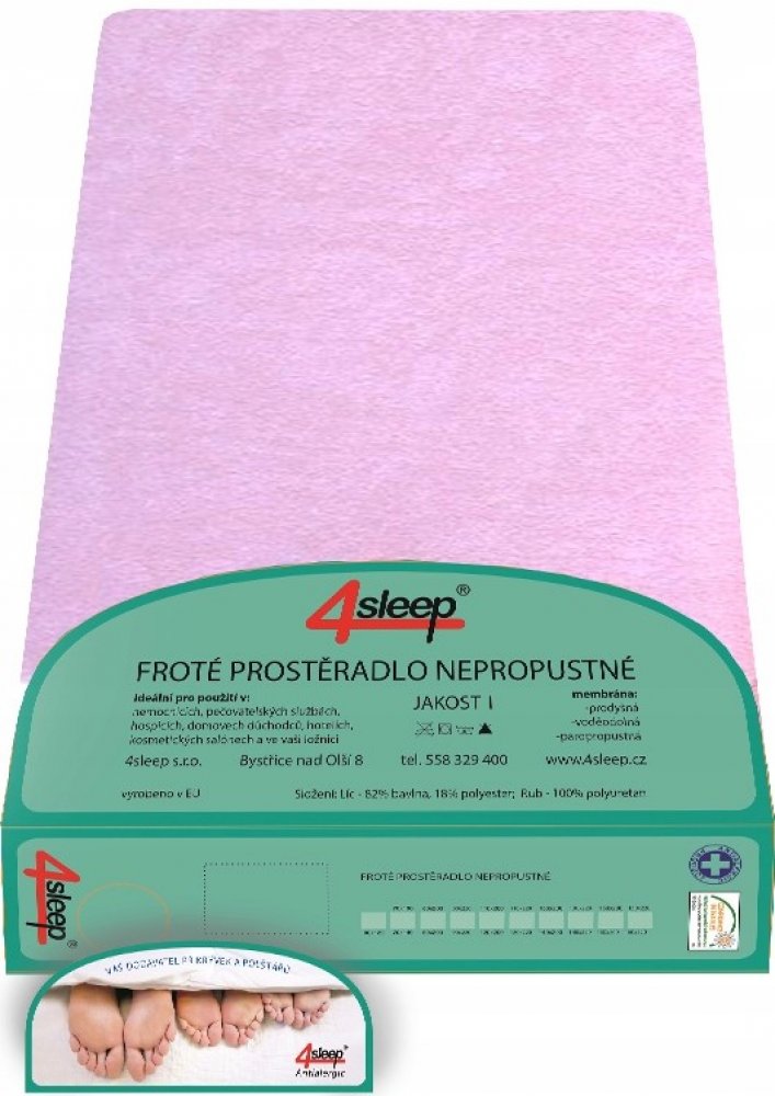 Nepromokavé prostěradlo froté s gumičkou barvy růžové o prodloužené velikosti 90x220cm na výšku matrace až 22cm. Prostěradlo je vhodné i pro starší lidi nebo no nemocnic.