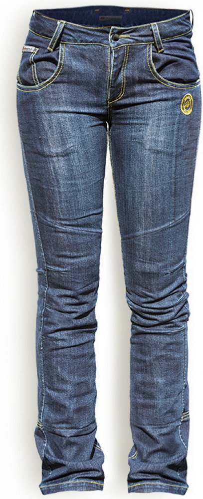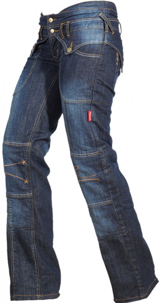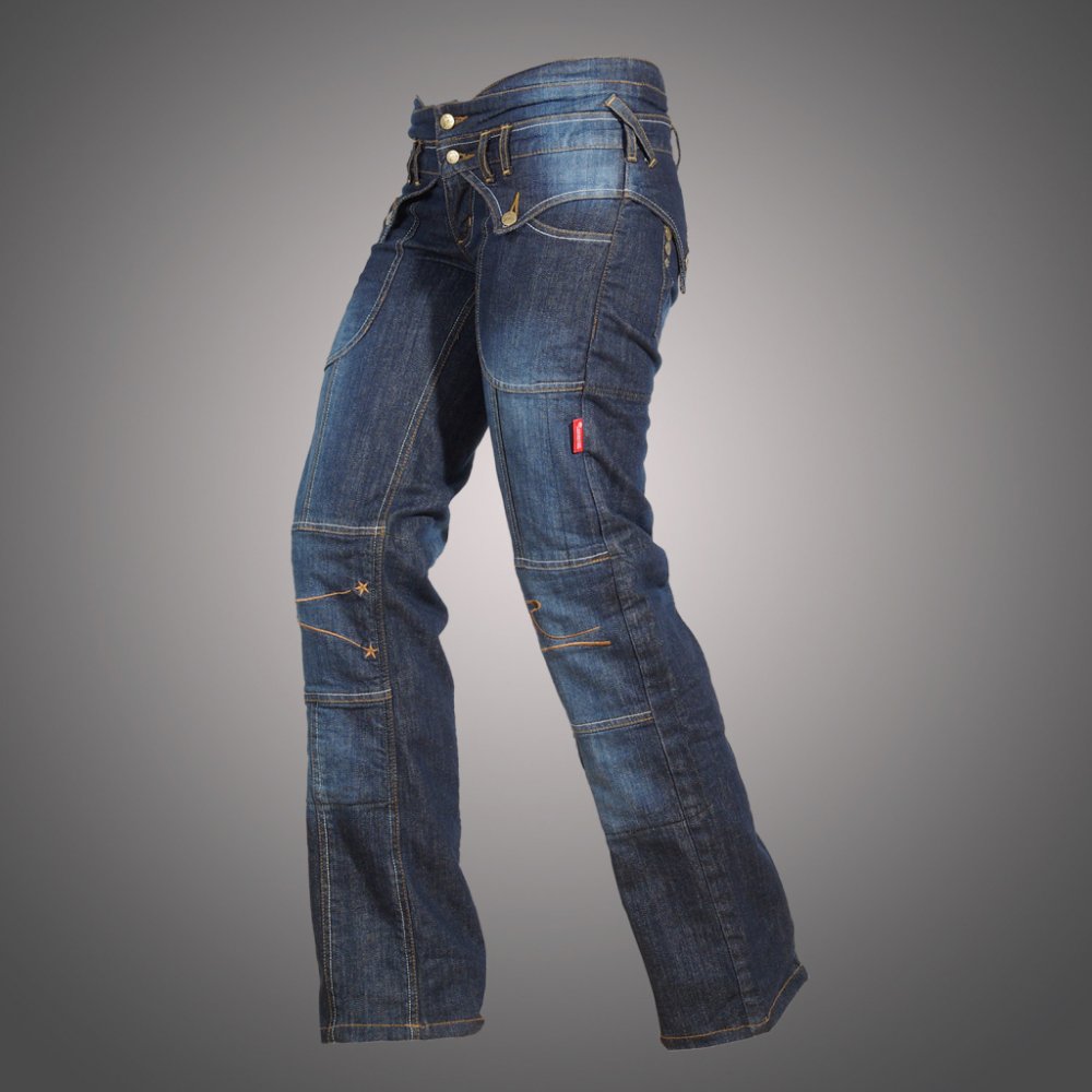 Představujeme Vám dámské kevlarové kalhoty na motocykl Denim střihem „slim“! Jsou vyrobeny ze 100% bavlny s použitím kevlarových nití pro větší pevnost. Z vnější strany vypadají jako běžné „denim džíny“, ale na vnitřní straně jsou potaženy kevlarem odolným proti oděru a sešity speciálním prošíváním.