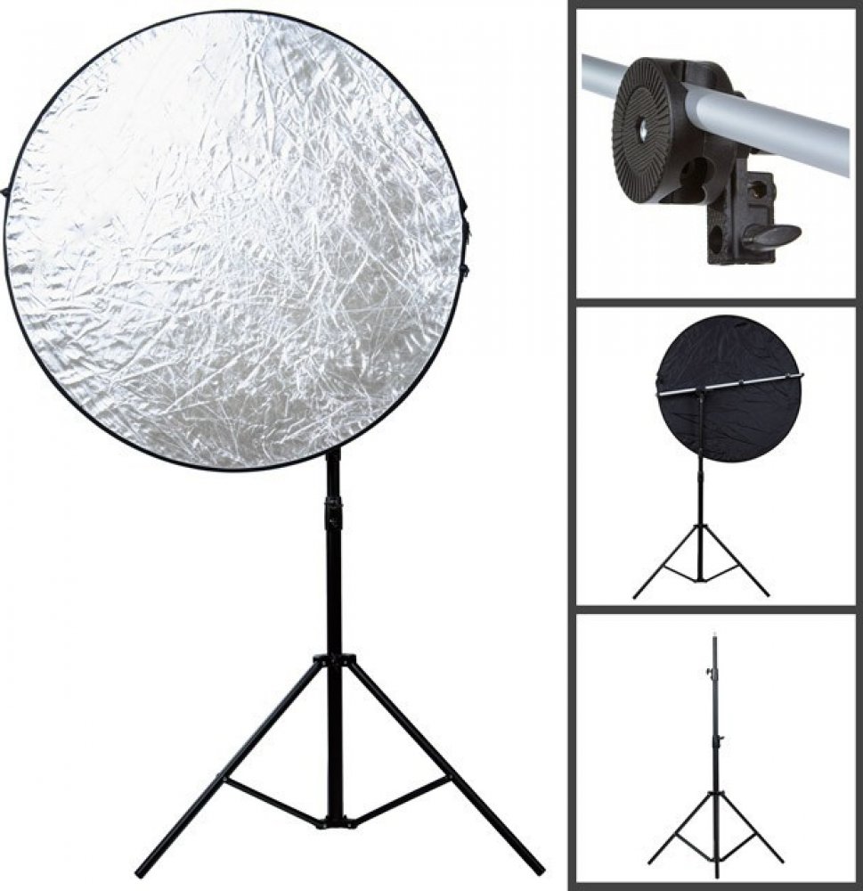 Šikovná náhrada za asistenta.Už se Vám stalo, že jste potřebovali podržet odraznou desku v určitém úhlu a v dosahu nebyly volné ruce? Pak je pro Vás zajímavým pomocníkem držák odrazné desky na studiovém stativu. Do držáku lze upnout odrazné desky s průměry od 65 cm až do 180 cm.Zvýhodněný set držáku odrazné desky se studiovým stativem 4studio LS-280B a odraznou deskou 5-v-1 o průměru 107cm. Odrazn...