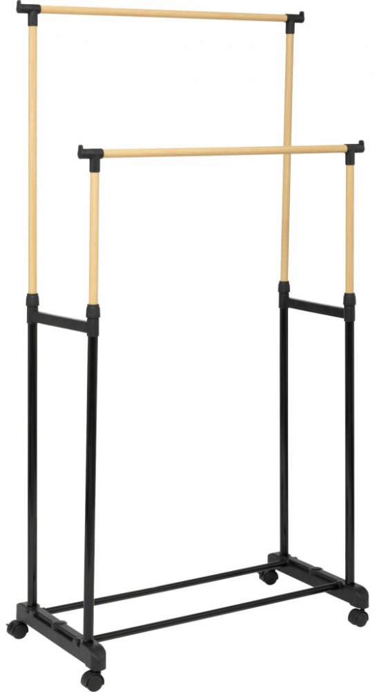 Stojan na oblečení s kolečky a dvojitými tyčemi na úložení - praktické řešení pro organizaci oděvů ve vašem doměPraktické řešení pro uložení: Stojan na oblečení WOODY o rozměrech 86 x 42 x 165 cm je ideálním řešením pro osoby hledající dodatečný prostor pro uložení oděvů. Díky dvojitým tyčím můžete snadno uspořádat své oblečení, což usnadňuje každodenní výběr stylizace.Pevná konstrukce: Vyroben z ...