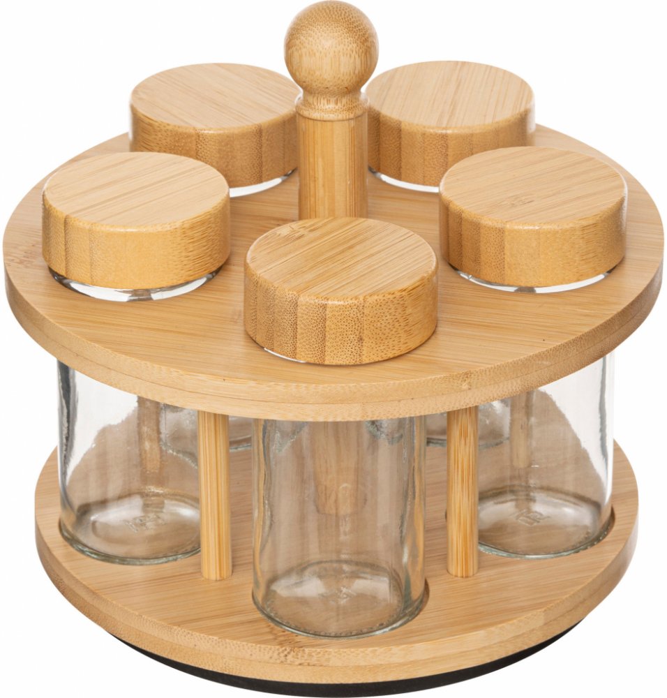 Otáčecí nádoba na koření z bambusu a skla - praktický design šetřící místo v kuchyniPraktický design: Otáčecí nádoba na koření COZY je ideálním řešením pro každého, kdo si cení pořádku v kuchyni. Díky kompaktním rozměrům (17 x 17,5 cm) se vejde na každou polici nebo pracovní desku, šetříc cenné místo.Vysoce kvalitní materiály: Vyrobená z bambusu a skla, nádoba je nejen estetická, ale také trvanlivá. Bambus FSC, což znamená, že je získáván způsobem udržitelným a šetrným k životnímu prostředí.Pohodlné skladování: Nádoba obsahuje čtyři skleněné nádobky o objemu 90 ml každá, což umožňuje skladování různorodých koření. Díky průhledným nádobkám snadno identifikujete obsah bez otevírání.Snadný přístup k koření: Otáčecí konstrukce umožňuje rychlé a pohodlné sahání po oblíbených kořeních při vaření. Už nikdy nebudete muset prohledávat skříňky při hledání správné chuti!Bezpečný kontakt s potravinami: Všechny materiály k výrobě nádoby jsou bezpečné v kontaktu s potravinami, což zajišťuje komfort a jistotu při přípravě jídel. Užijte si chuť čerstvých koření bez obav!