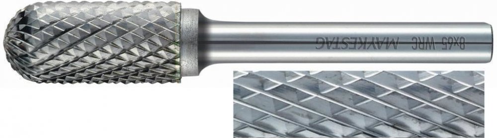 Karbidová soudkově kulatá technická fréza typu WRC s řezným profilem dle DIN MX, 6 mm válcovou stopkou, průměrem pracovní části 6 mm, délkou pracovní části 16 mm a celkovou délkou 50 mm.