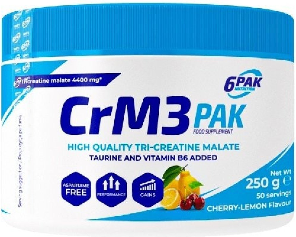 6PAK Nutrition CrM3 PAK byl vytvořen pro nejnáročnější sportovce, kteří hledají produkty nejvyšší kvality a účinku. Vzorec preparátu obsahuje rovněž přídavek taurinu a vitamínu B6. Stojí za zmínku, že maláttrikreatin se vyznačuje větší chemickou stabilitou (nepřeměňuje se tak snadno na nepotřebný kreatin) na rozdíl od klasického monohydrátu kreatinu. Rovněž se mnohem lépe rozpouští, což je důležité pro stravitelnost každé porce. Malát kreatinu se skládá z molekuly kreatinu a malátu, který náleží do skupiny hydrokarboxylových kyselin, mající schopnost stimulace inzulínu, jednoho z nejdůležitějších hormonů (mimo jiné je nositelem kreatinu do svalových buněk).