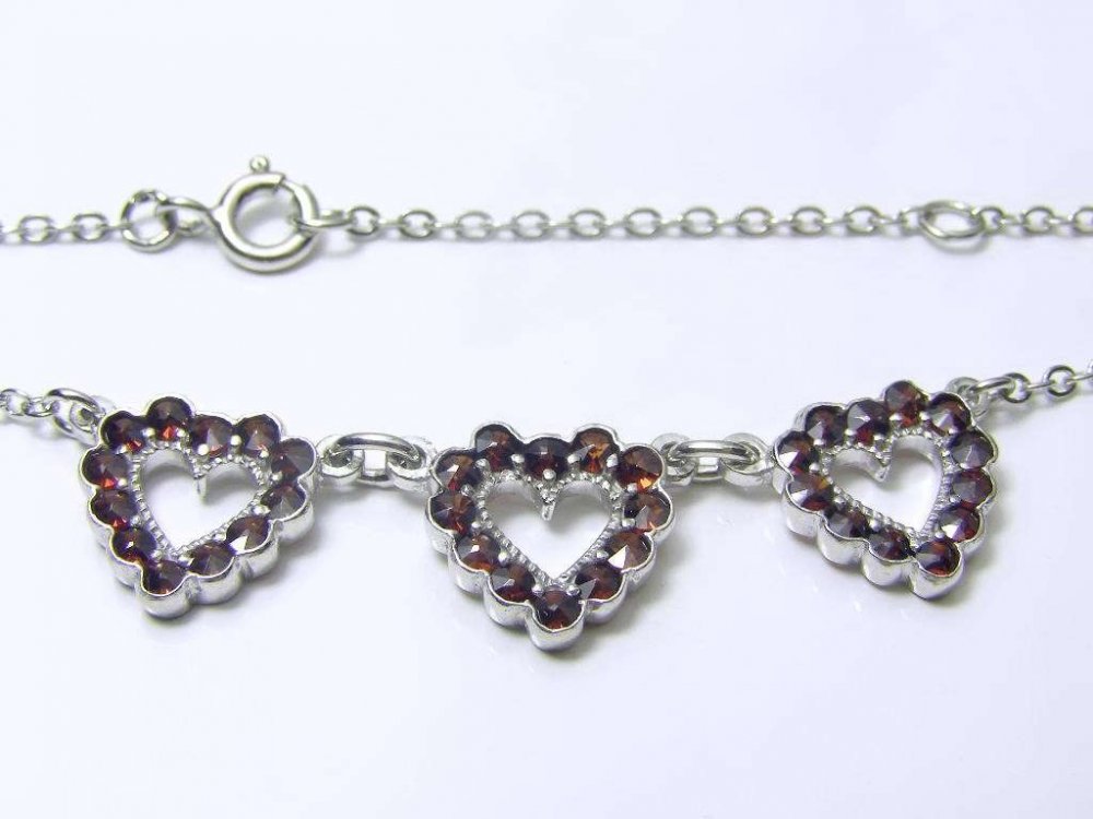 Stříbrný náhrdelník ozdobený ve středové části srdíčky s českými granáty, nastavitelná délka 42 - 45cm.