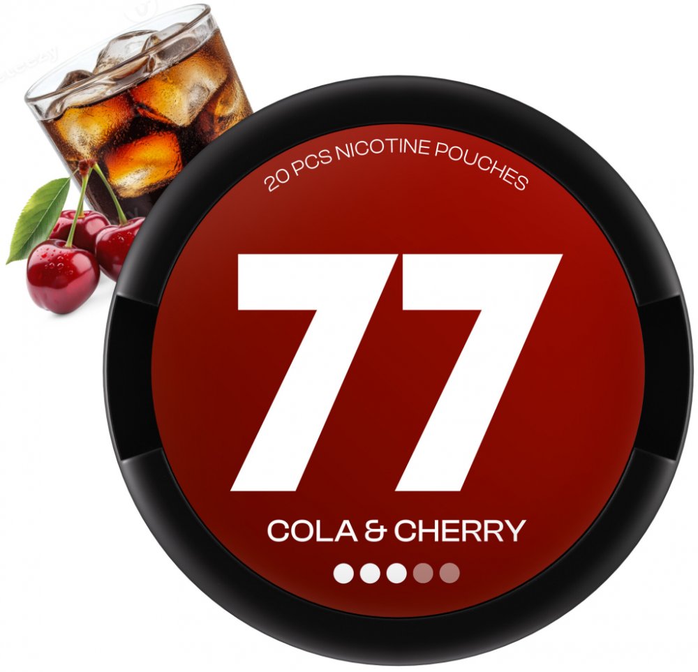 Nikotinové sáčky 77 Cola & Cherry Medium přinášejí sladkou a osvěžující chuť coly doplněnou o ovocné tóny třešně. Každý slim sáček obsahuje 16 mg/g nikotinu (přibližně 10,4 mg na sáček)