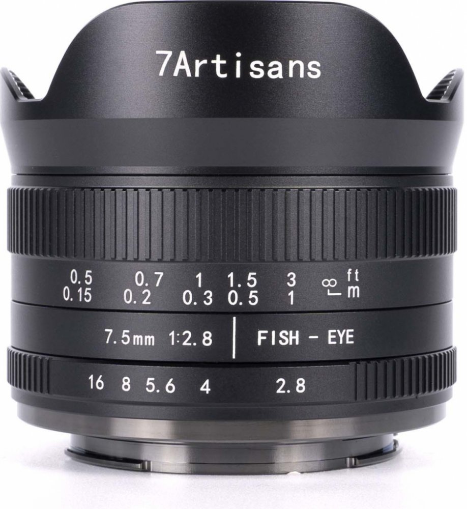Širokoúhlý APS-C objektiv typu "Rybí oko" 7,5 mm od společností 7Artisans. Optická konstrukce objektivu se skládá z 11 prvků v 9 skupinách, ovladatelný rozsah clony je od f/2,8 do f/16. Objektiv disponuje 190° pozorovacím úhlem, 7-lamelovou clonou a manuální clonou/ostřením. Minimální zaostřovací vzdálenost je 15 cm.