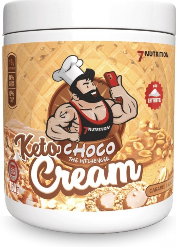 Lahodný karamelový krém s praženými arašídy 7Nutrition Keto Cream. Skvěle se hodí jako svačina během dne i jako doplněk k palačinkám, vaflím, omeletám... a mnoho dalšího! Obsahuje sladidlo a přirozeně se vyskytující cukry. Je bez přidaného palmového tuku a cukru.