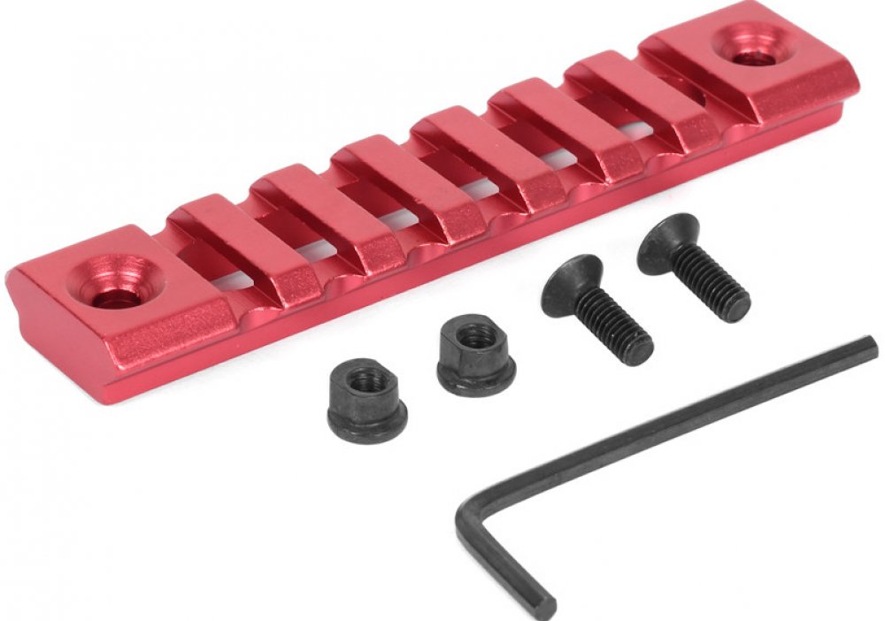 Jeden kus kovové odlehčené RIS lišty pro KeyMod předpažbí. Celková délka je 9,3 cm a šíře lišty je standardní 22mm. Na liště je 7 slotů a váží pouhých 20 gramů. Má červenou lesklou povrchovou úpravu a vyrobena je z lehkého, ale pevného hliníku. Ideální pokud chcete přidat rukojeť, svítilnu, laserový zaměřovač nebo dvojnožku na předpažbí s KeyMod systémem.