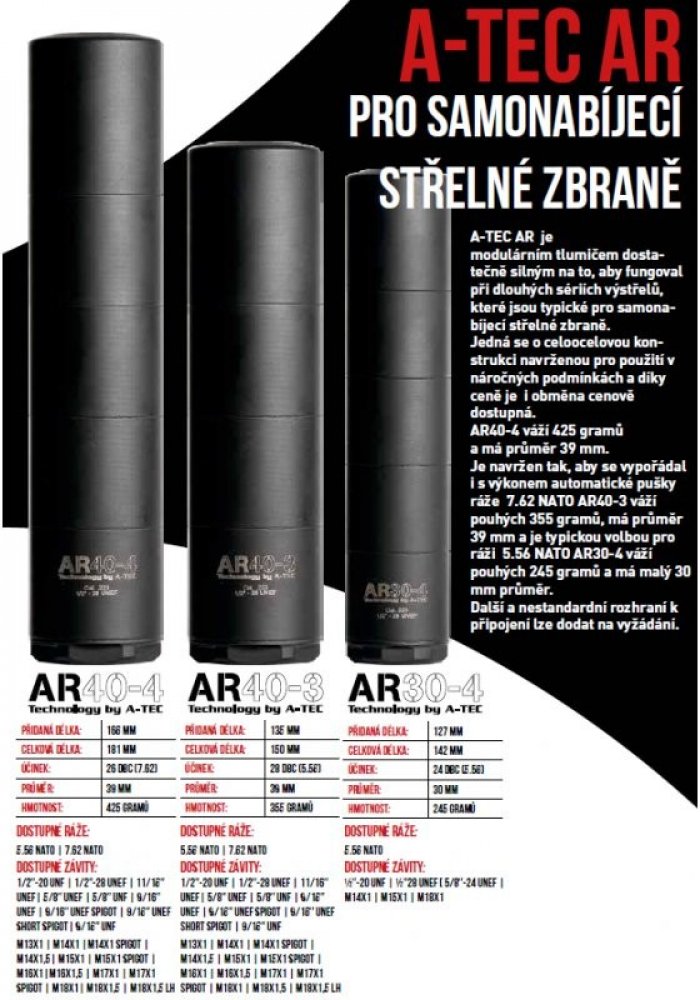 A-TEC AR - kompletní popis technická data, seznam ráží a systémů upnutí v katalogu A-TEC v Českém jazyce ke stažení na našich stránkách. Tlumiče vyrobeny pro moderní samonabíjecí pušky, kde je předpoklad vyšší zátěže intenzivní střelbou v samonabíjecím režimu, než je tomu např. při lovu. Především jsou určeny pro zbraně typu AR-15/MSR-15 a AR-10/MSR-10 apod. Model AR40-3 se závitem M14x1 je vhodný např. pro civilní varianty pušky vz.58 Tyto tlumiče budou nabízeny s příslušnými závity i pro pušky Bren 2, AUG atd.. Modulové tlumiče se všemi výhodami snažší údržby a čištění. Povrch Cerakote