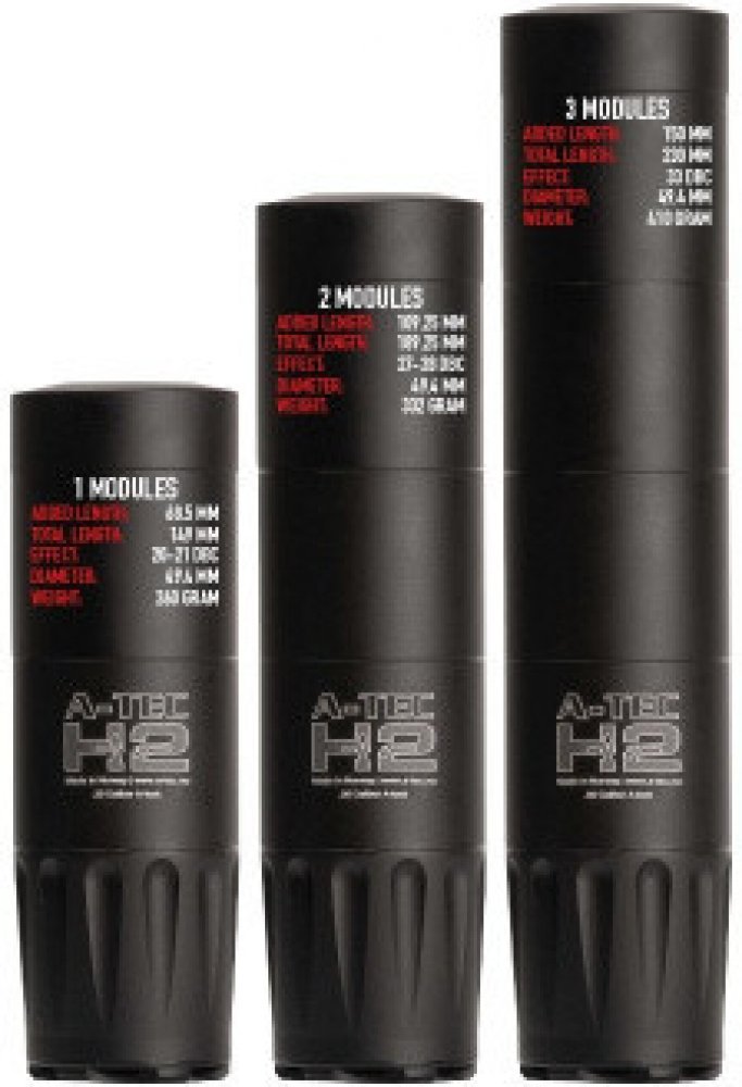Modulový tlumič H2 pro zbraně s ráží do .375 (9,5 mm) a na závit M17x1mm od A-TEC H2 je kvalitní a velmi populární tří modulový tlumič na zbraně od norského výrobce A-TEC, který je určen pro opakovací, samonabíjecí, lovecké a sportovní zbraně bez předních mířidel. Modely H2 jsou dostupné ve více verzích pro velké množství ráží a závitů. Modulový tlumič H2 po instalaci překrývá 8 cm hlavně zbraně. ...