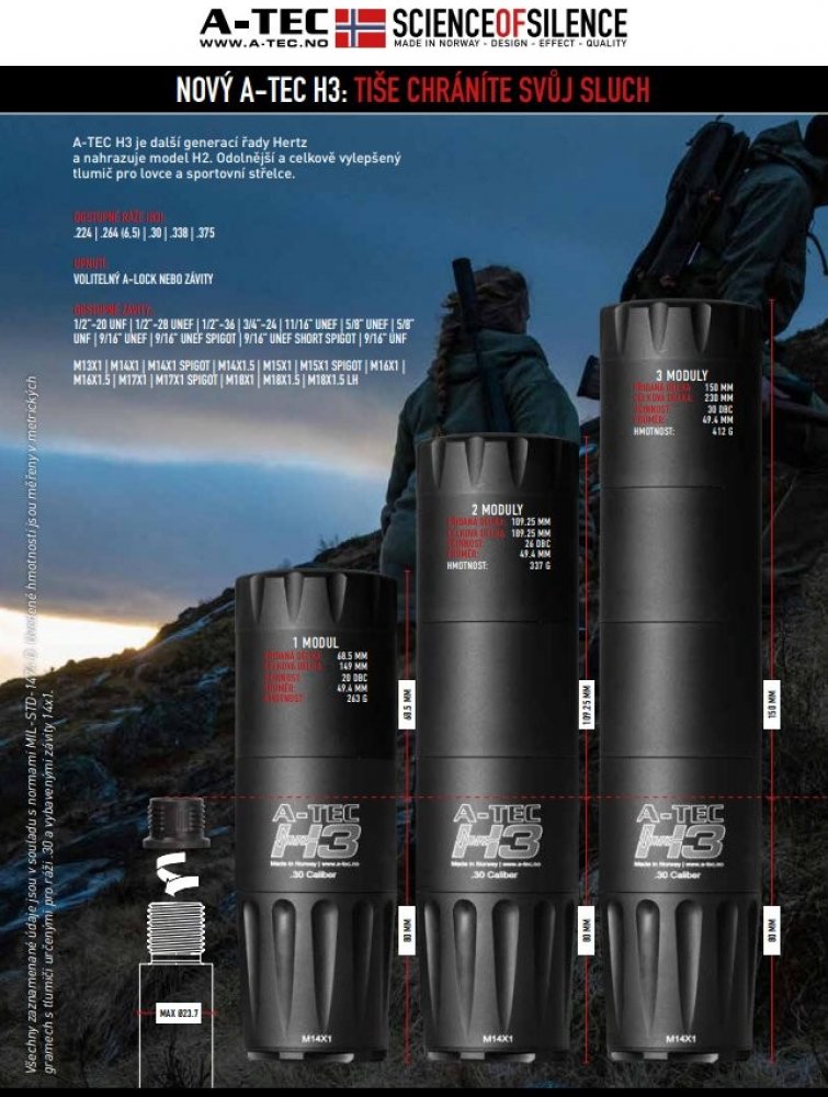 A-TEC H3 nahrazuje doposud nejžádanější a nejprodávanější model H2. Přináší vyšší účinnost (zejména u prvního výstřelu), odolnější konstrukci s ohledem na méně pečlivou údržbu, modernější design a nižší hmotnost. Model H3 je modulový tlumič určen pro opakovací i samonabíjecí lovecké a sportovní zbraně bez předních mířidel. Reflexní tělo jde cca 8 ,cm zpět přes hlaveň a s třemi moduly přidává ~15 ,cm k celkové délce zbraně.