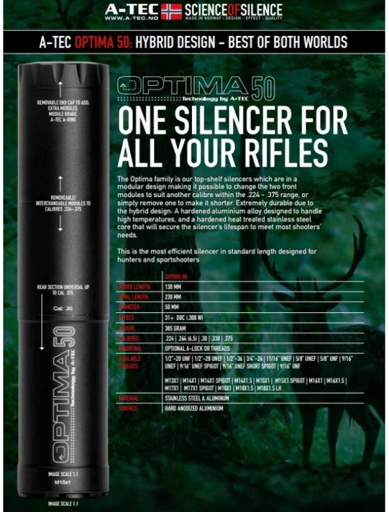 Kompletní popis, technická data, seznam ráží a systémů upnutí najdete v katalogu A-TEC v češtině ke stažení níže. Modely Optima 50, 60 a 45 jsou určeny pro lovecké a sportovní opakovací i samonabíjecí zbraně bez předních mířidel. Reflexní konstrukce jde cca 8 ,cm zpět přes hlaveň a přidává pouze ~15 ,cm k celkové délce zbraně. Přední modul tlumiče je výměnný, takže můžete mít jeden tlumič a měnit sadu modulů pro různé ráže.