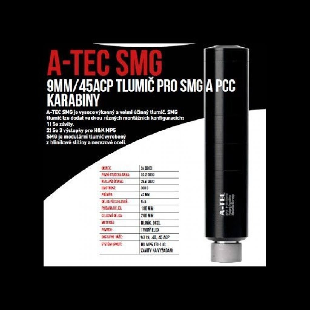 A-TEC SMG Tlumiče určeny pro samonabíjecí karabiny na pistolové náboje. Bude dodáván např. i pro karabiny EVO, Stribog, Heckler Koch, PCC atd. Modulový tlumič se všemi výhodami, jako snažší a pohodlnější čištění a údržba, možnost odebrání modulu pro kompaktnější rozměry.